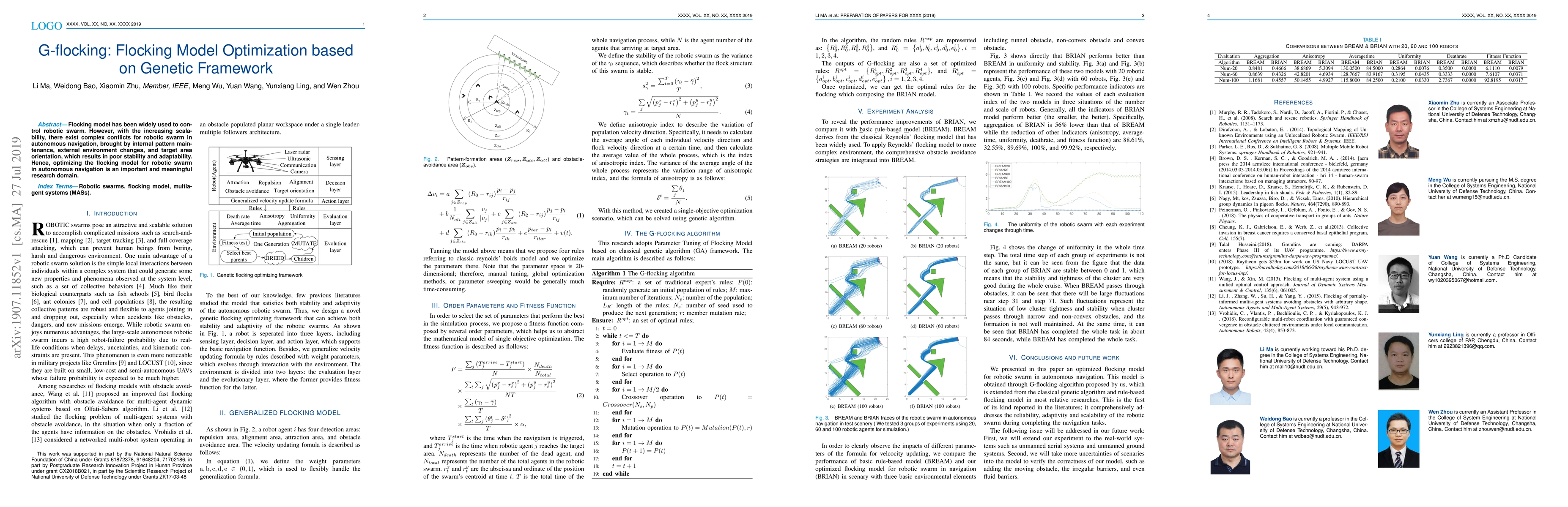 Flocking model has been widely used to control robotic swarm. However, with the increasing scalability, there exist complex conflicts for robotic swarm in autonomous navigation, brought by internal pattern maintenance, external environment changes, and target area orientation, which results in poor stability and adaptability. Hence, optimizing the flocking model for robotic swarm in autonomous navigation is an important and meaningful research domain.