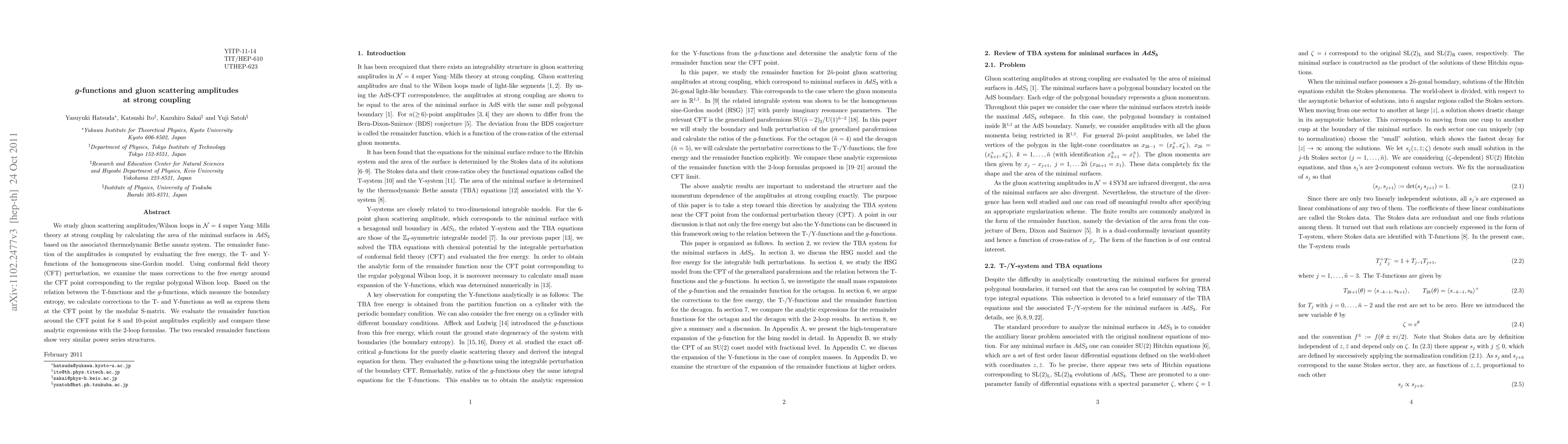 This paper investigates gluon scattering amplitudes and Wilson loops in N=4 super Yang-Mills theory at strong coupling, utilizing minimal surface areas in AdS_3 and thermodynamic Bethe ansatz. It computes the remainder functions via free energy and T- and Y-functions of the sine-Gordon model, and compares these with 2-loop formulas, finding similar power series structures.