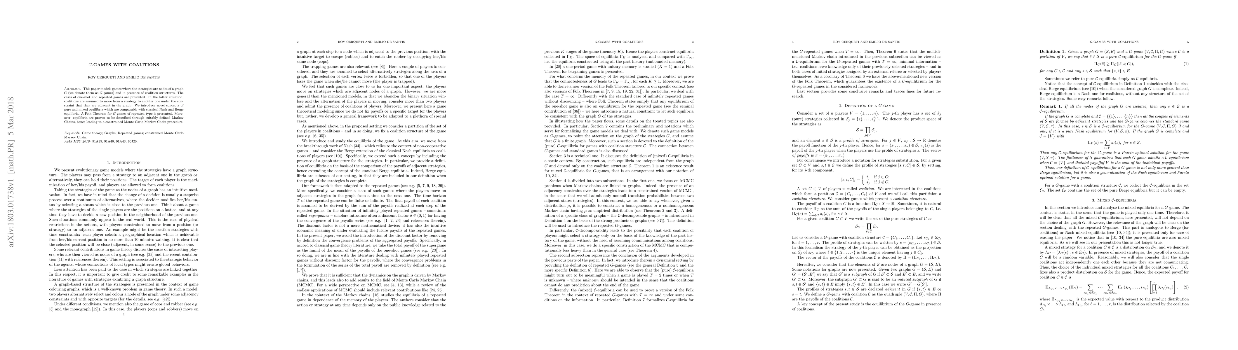 This paper models G-games on graph G with coalition structures, introducing pure and mixed equilibria comparable to Nash and Berge equilibria. It presents a Folk Theorem for repeated G-games and describes equilibria via Markov Chains, leading to a constrained Monte Carlo Markov Chain procedure.