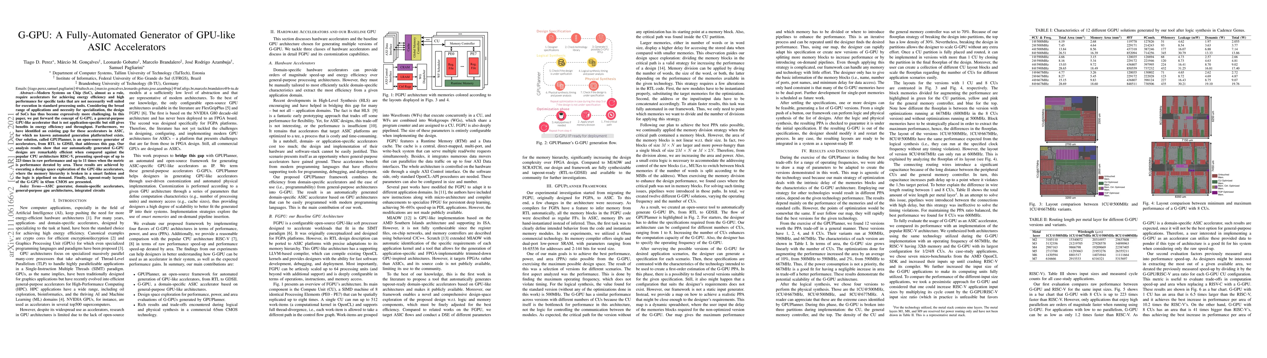 Modern Systems on Chip (SoC), almost as a rule, require accelerators for achieving energy efficiency and high performance for specific tasks that are not necessarily well suited for execution in standard processing units. Considering the broad range of applications and necessity for specialization, the design of SoCs has thus become expressively more challenging. In this paper, we put forward the concept of G-GPU, a general-purpose GPU-like accelerator that is not application-specific but still gives benefits in energy efficiency and throughput. Furthermore, we have identified an existing gap for these accelerators in ASIC, for which no known automated generation platform/tool exists. Our solution, called GPUPlanner, is an open-source generator of accelerators, from RTL to GDSII, that addresses this gap. Our analysis results show that our automatically generated G-GPU designs are remarkably efficient when compared against the popular CPU architecture RISC-V, presenting speed-ups of up to 223 times in raw performance and up to 11 times when the metric is performance derated by area. These results are achieved by executing a design space exploration of the GPU-like accelerators, where the memory hierarchy is broken in a smart fashion and the logic is pipelined on demand. Finally, tapeout-ready layouts of the G-GPU in 65nm CMOS are presented.