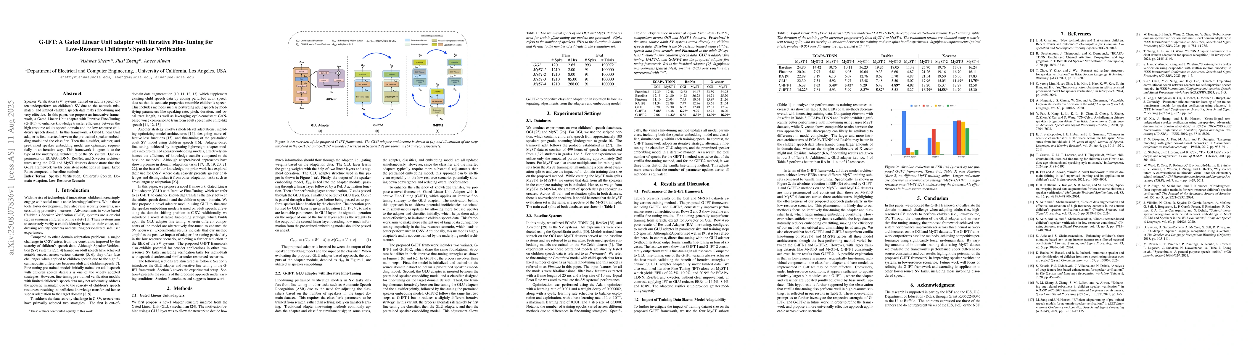 The research proposes G-IFT, a framework integrating a Gated Linear Unit (GLU) adapter with iterative fine-tuning to enhance knowledge transfer for low-resource children's speaker verification, evaluated on ECAPA-TDNN, ResNet, and X-vector architectures using OGI and MyST datasets.