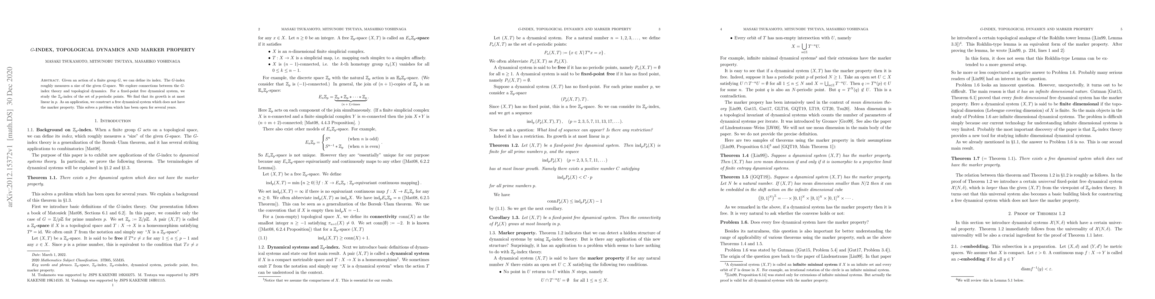 Given an action of a finite group $G$, we can define its index. The $G$-index roughly measures a size of the given $G$-space. We explore connections between the $G$-index theory and topological dynamics. For a fixed-point free dynamical system, we study the $\mathbb{Z}_p$-index of the set of $p$-periodic points. We find that its growth is at most linear in $p$. As an application, we construct a free dynamical system which does not have the marker property. This solves a problem which has been open for several years.