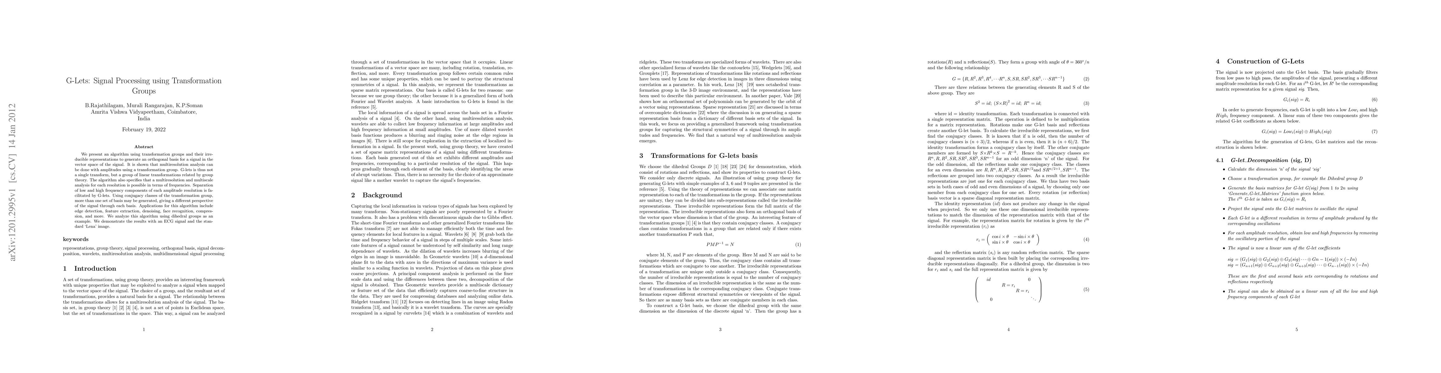 This paper introduces G-lets, an algorithm that leverages transformation groups and their irreducible representations to create an orthogonal basis for signal processing. It enables multiresolution and multiscale analysis, facilitating the separation of frequency components and offering diverse perspectives on signals through various basis sets. Applications include edge detection, feature extraction, and image compression.