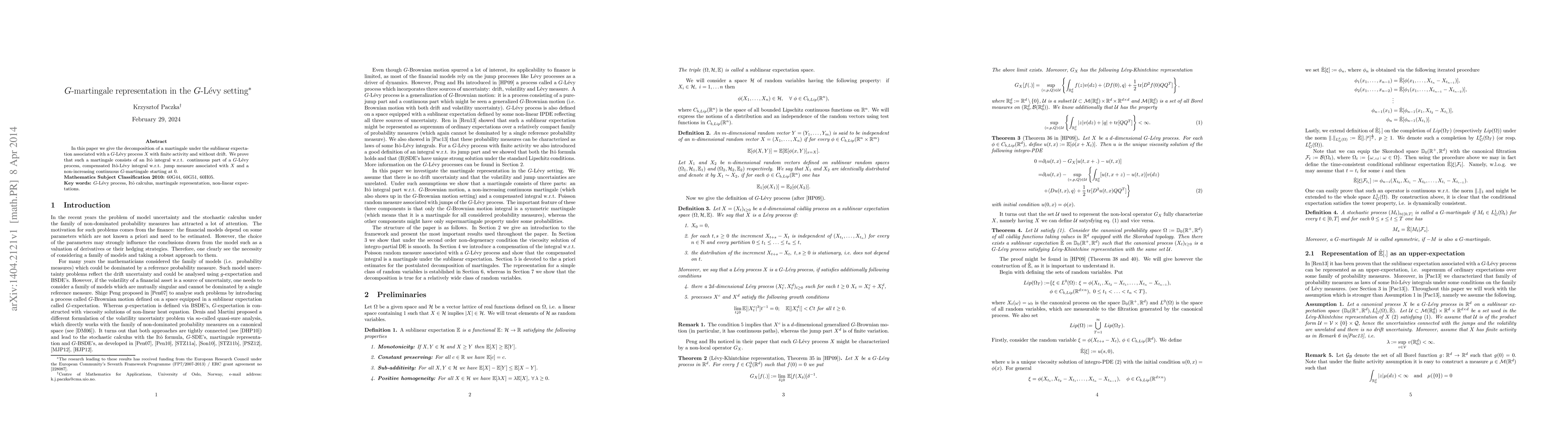 This paper decomposes a martingale under a sublinear expectation linked to a $G$-Lévy process, showing it consists of an Ito integral, a compensated Ito-Lévy integral, and a non-increasing continuous $G$-martingale starting at zero.