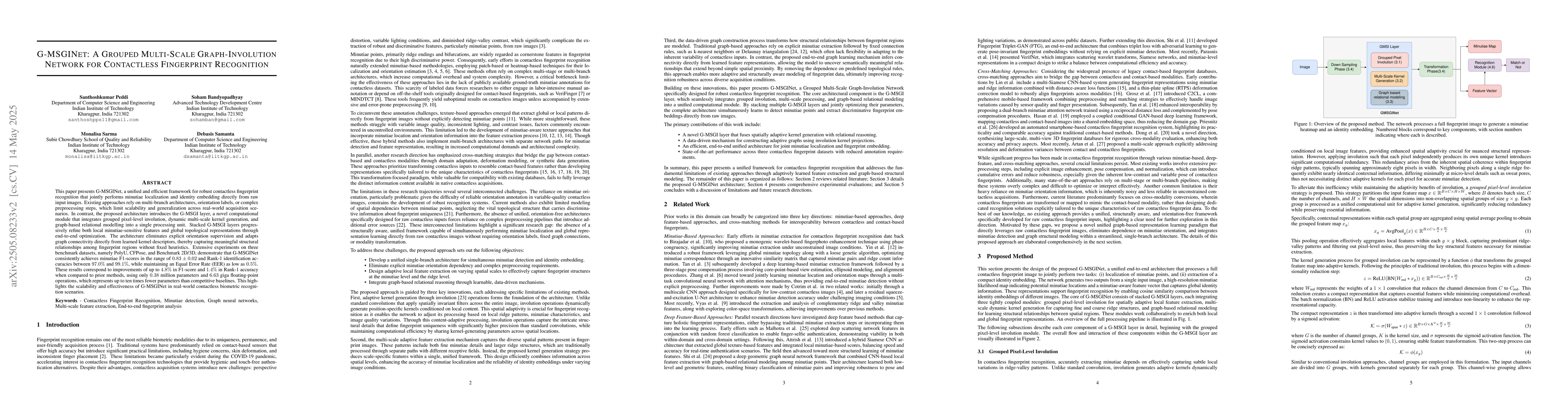 The paper introduces G-MSGINet, a unified framework for contactless fingerprint recognition that jointly performs minutiae localization and identity embedding directly from raw input images. It features the GMSGI layer, integrating grouped pixel-level involution, dynamic multi-scale kernel generation, and graph-based relational modeling.