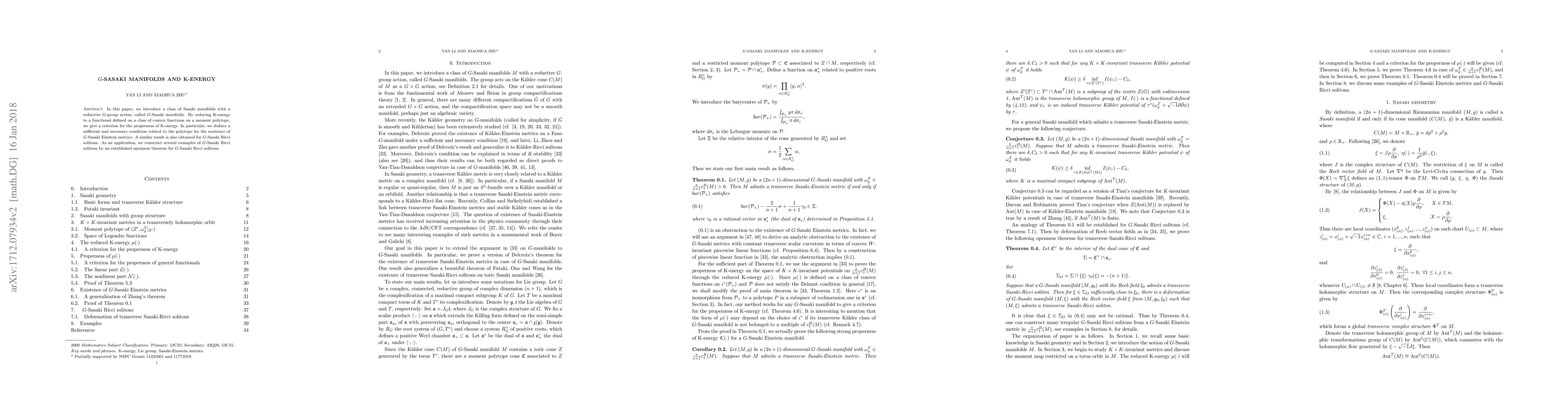In this paper, we introduce a class of Sasaki manifolds with a reductive $G$-group action, called $G$-Sasaki manifolds. By reducing K-energy to a functional defined on a class of convex functions on a moment polytope, we give a criterion for the properness of K-energy. In particular, we deduce a sufficient and necessary condition related to the polytope for the existence of transverse $G$-Sasaki Einstein metrics. A similar result is also obtained for transverse $G$-Sasaki Ricci solitons. As an application, we construct several examples of $G$-Sasaki Ricci solitons by an established openness theorem for transverse $G$-Sasaki Ricci solitons.