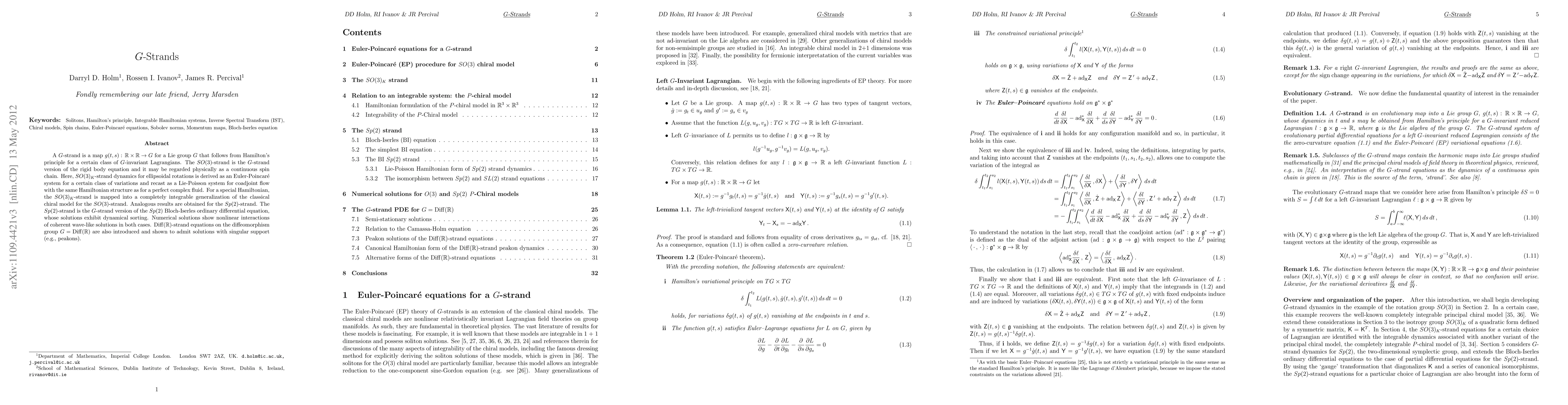 A $G$-strand is a map $g(t,{s}):\,\mathbb{R}\times\mathbb{R}\to G$ for a Lie group $G$ that follows from Hamilton's principle for a certain class of $G$-invariant Lagrangians. The SO(3)-strand is the $G$-strand version of the rigid body equation and it may be regarded physically as a continuous spin chain. Here, $SO(3)_K$-strand dynamics for ellipsoidal rotations is derived as an Euler-Poincar\'e system for a certain class of variations and recast as a Lie-Poisson system for coadjoint flow with the same Hamiltonian structure as for a perfect complex fluid. For a special Hamiltonian, the $SO(3)_K$-strand is mapped into a completely integrable generalization of the classical chiral model for the SO(3)-strand. Analogous results are obtained for the $Sp(2)$-strand. The $Sp(2)$-strand is the $G$-strand version of the $Sp(2)$ Bloch-Iserles ordinary differential equation, whose solutions exhibit dynamical sorting. Numerical solutions show nonlinear interactions of coherent wave-like solutions in both cases. ${\rm Diff}(\mathbb{R})$-strand equations on the diffeomorphism group $G={\rm Diff}(\mathbb{R})$ are also introduced and shown to admit solutions with singular support (e.g., peakons).