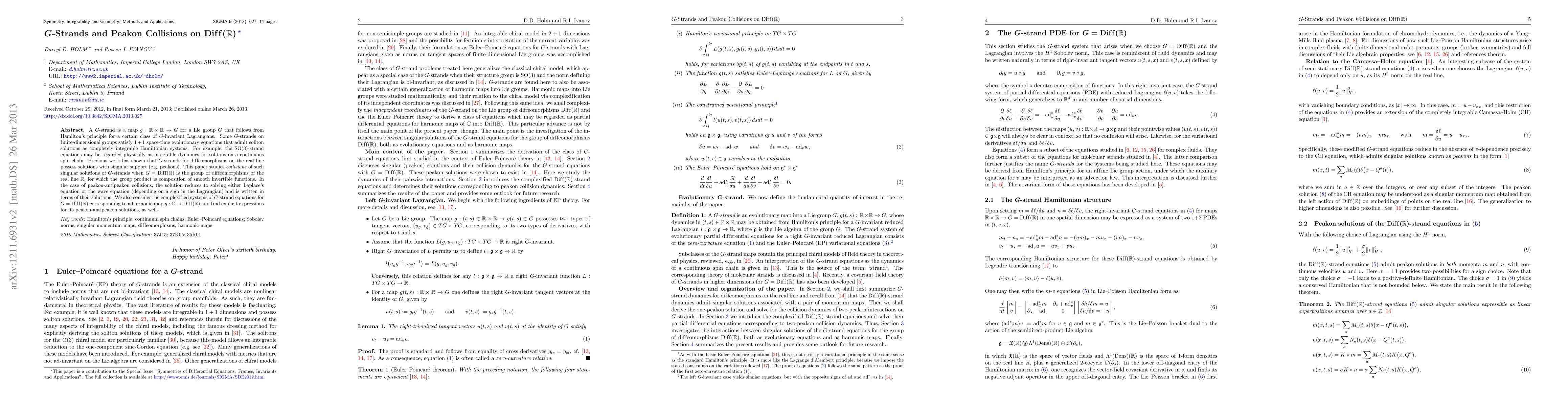 A $G$-strand is a map $g:\mathbb{R}\times\mathbb{R}\to G$ for a Lie group $G$ that follows from Hamilton's principle for a certain class of $G$-invariant Lagrangians. Some $G$-strands on finite-dimensional groups satisfy 1+1 space-time evolutionary equations that admit soliton solutions as completely integrable Hamiltonian systems. For example, the ${\rm SO}(3)$-strand equations may be regarded physically as integrable dynamics for solitons on a continuous spin chain. Previous work has shown that $G$-strands for diffeomorphisms on the real line possess solutions with singular support (e.g. peakons). This paper studies collisions of such singular solutions of $G$-strands when $G={\rm Diff}(\mathbb{R})$ is the group of diffeomorphisms of the real line $\mathbb{R}$, for which the group product is composition of smooth invertible functions. In the case of peakon-antipeakon collisions, the solution reduces to solving either Laplace's equation or the wave equation (depending on a sign in the Lagrangian) and is written in terms of their solutions. We also consider the complexified systems of $G$-strand equations for $G={\rm Diff}(\mathbb{R})$ corresponding to a harmonic map $g: \mathbb{C}\to{\rm Diff}(\mathbb{R})$ and find explicit expressions for its peakon-antipeakon solutions, as well.