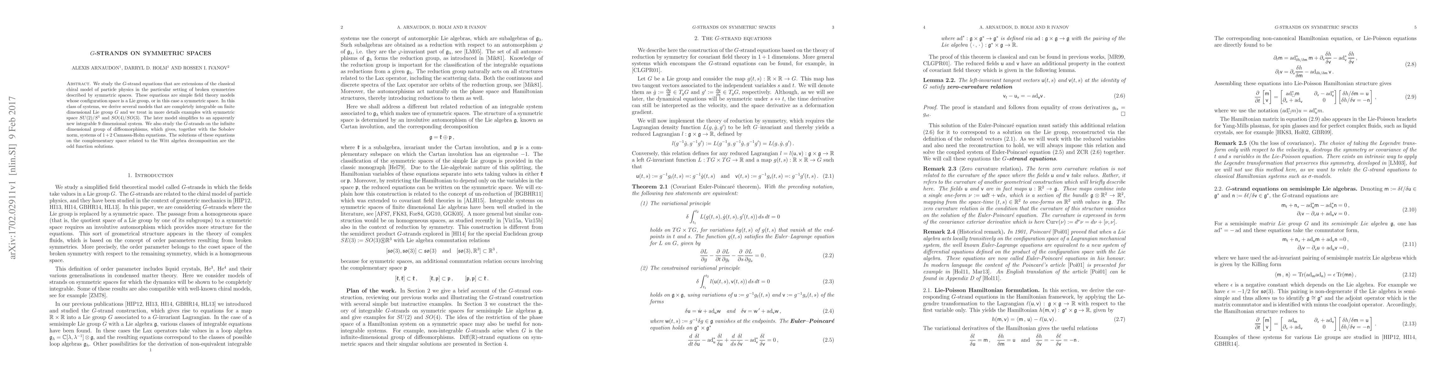 We study the $G$-strand equations that are extensions of the classical chiral model of particle physics in the particular setting of broken symmetries described by symmetric spaces. These equations are simple field theory models whose configuration space is a Lie group, or in this case a symmetric space. In this class of systems, we derive several models that are completely integrable on finite dimensional Lie group $G$ and we treat in more details examples with symmetric space $SU(2)/S^1$ and $SO(4)/SO(3)$. The later model simplifies to an apparently new integrable $9$ dimensional system. We also study the $G$-strands on the infinite dimensional group of diffeomorphisms, which gives, together with the Sobolev norm, systems of $1+2$ Camassa-Holm equations. The solutions of these equations on the complementary space related to the Witt algebra decomposition are the odd function solutions.