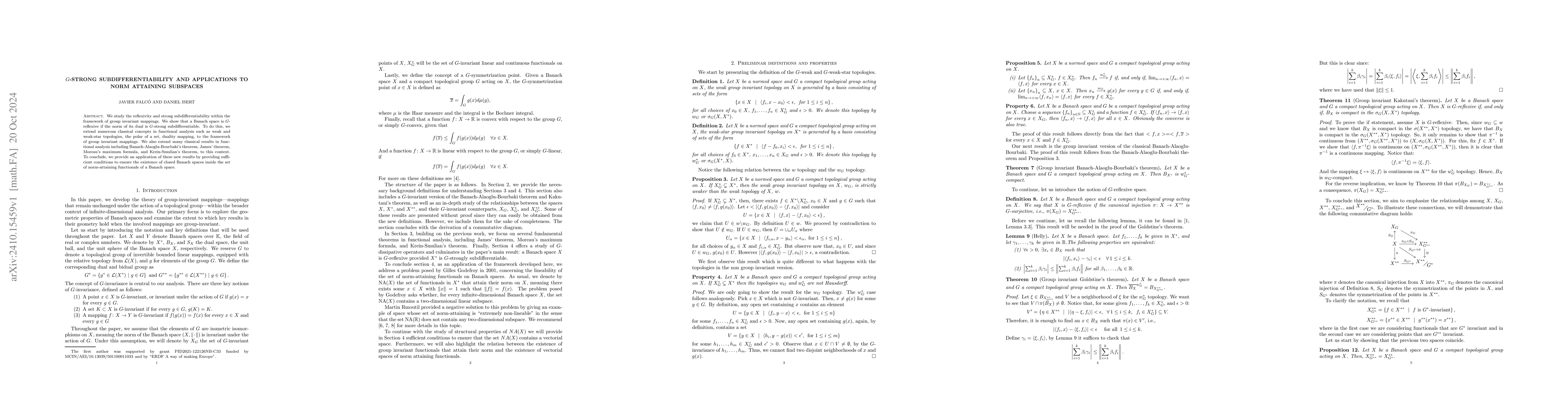 This paper investigates the reflexivity and strong subdifferentiability within group invariant mappings, proving that a Banach space is G-reflexive if its dual norm is G-strong subdifferentiable. It extends various classical functional analysis concepts and theorems to this new framework, ultimately providing conditions for the existence of closed Banach spaces within norm-attaining functionals.