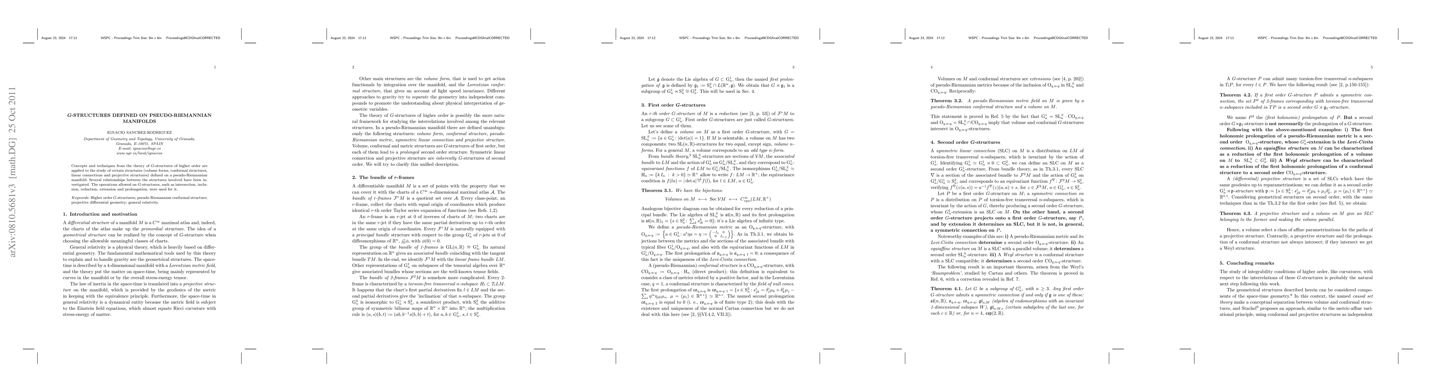 Concepts and techniques from the theory of G-structures of higher order are applied to the study of certain structures (volume forms, conformal structures, linear connections and projective structures) defined on a pseudo-Riemanniann manifold. Several relationships between the structures involved have been investigated. The operations allowed on G-structures, such as intersection, inclusion, reduction, extension and prolongation, were used for it.