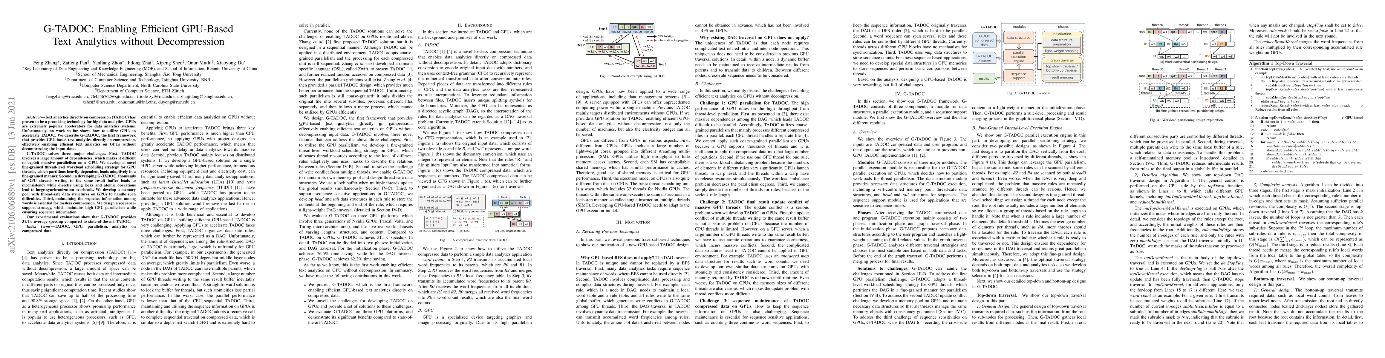 G-TADOC introduces a novel framework for GPU-based text analytics directly on compressed data, overcoming challenges of parallelism, synchronization, and sequence information maintenance. It achieves a 31.1x average speedup over existing methods.