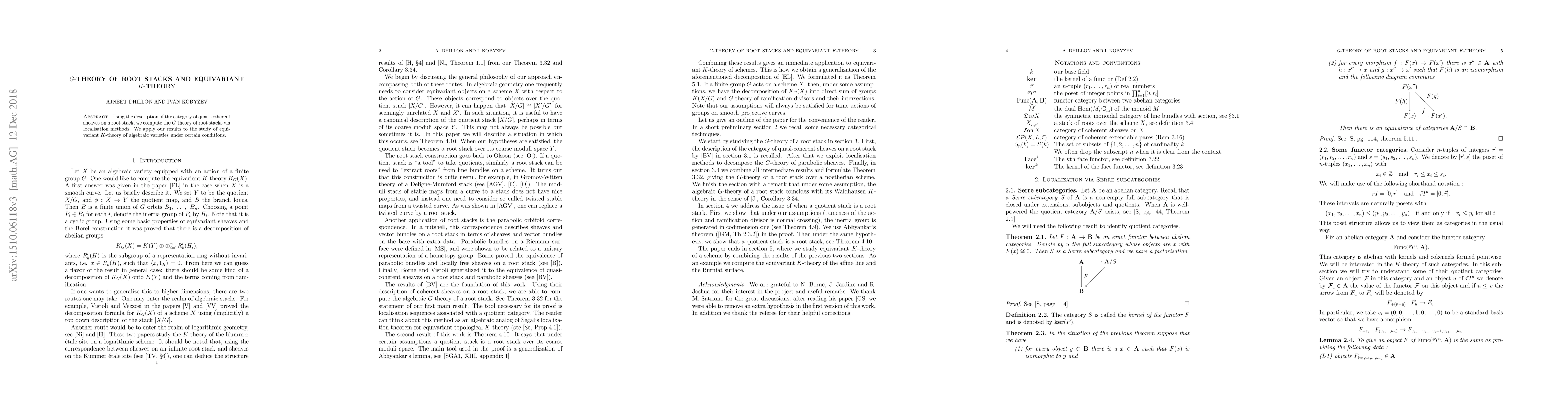 This paper investigates the G-theory of root stacks using localization techniques, extending the work of Borne and Vistoli, and applies these results to understand the equivariant K-theory of algebraic varieties under specific conditions.