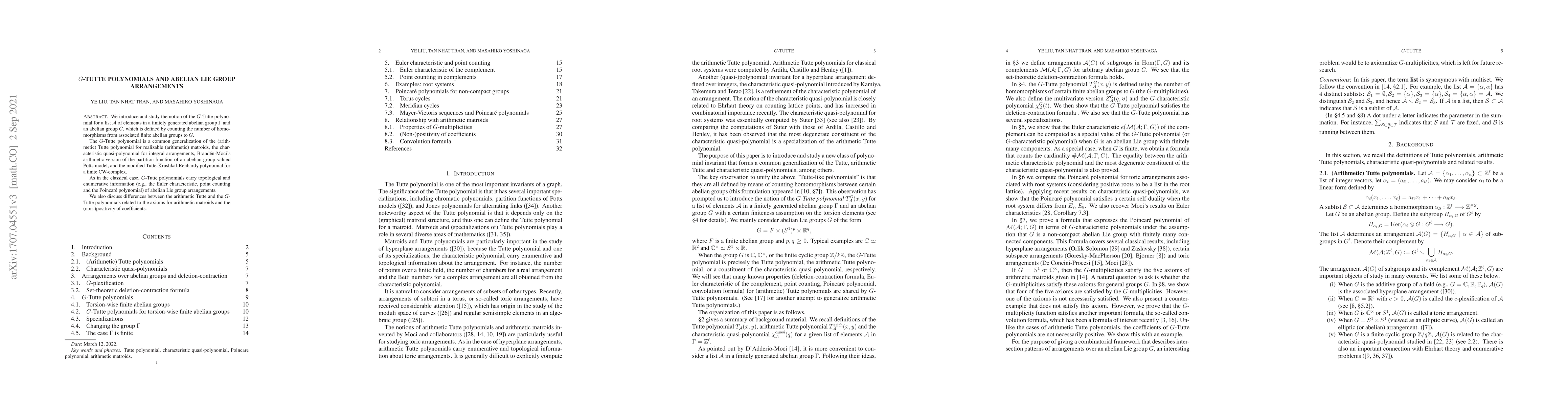The paper introduces $G$-Tutte polynomials for abelian group arrangements, which generalize several known polynomials, and discusses their topological and enumerative properties, along with differences from classical Tutte polynomials.