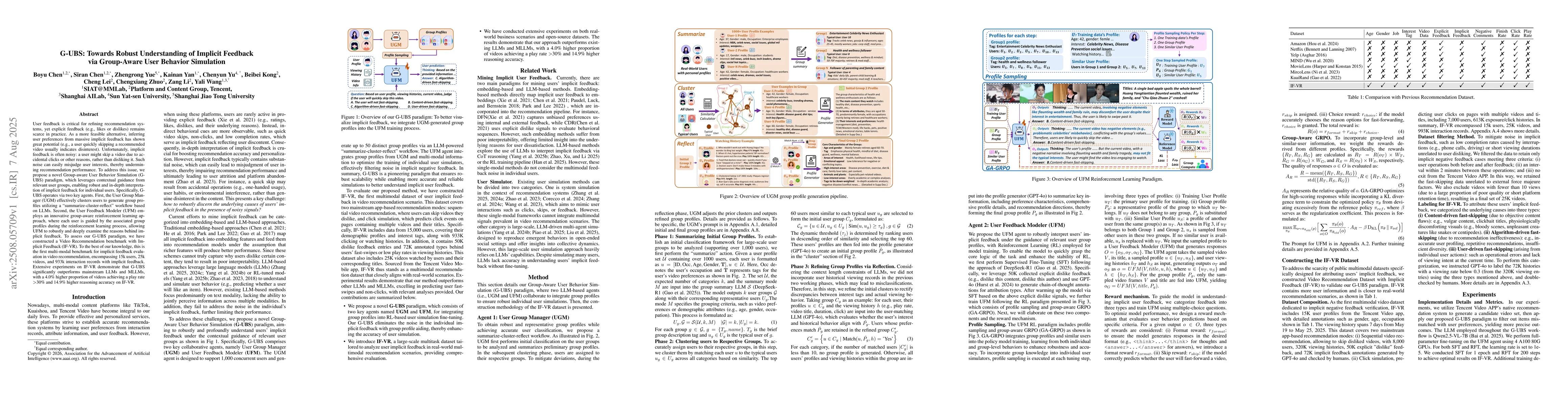User feedback is critical for refining recommendation systems, yet explicit feedback (e.g., likes or dislikes) remains scarce in practice. As a more feasible alternative, inferring user preferences from massive implicit feedback has shown great potential (e.g., a user quickly skipping a recommended video usually indicates disinterest). Unfortunately, implicit feedback is often noisy: a user might skip a video due to accidental clicks or other reasons, rather than disliking it. Such noise can easily misjudge user interests, thereby undermining recommendation performance. To address this issue, we propose a novel Group-aware User Behavior Simulation (G-UBS) paradigm, which leverages contextual guidance from relevant user groups, enabling robust and in-depth interpretation of implicit feedback for individual users. Specifically, G-UBS operates via two key agents. First, the User Group Manager (UGM) effectively clusters users to generate group profiles utilizing a ``summarize-cluster-reflect" workflow based on LLMs. Second, the User Feedback Modeler (UFM) employs an innovative group-aware reinforcement learning approach, where each user is guided by the associated group profiles during the reinforcement learning process, allowing UFM to robustly and deeply examine the reasons behind implicit feedback. To assess our G-UBS paradigm, we have constructed a Video Recommendation benchmark with Implicit Feedback (IF-VR). To the best of our knowledge, this is the first multi-modal benchmark for implicit feedback evaluation in video recommendation, encompassing 15k users, 25k videos, and 933k interaction records with implicit feedback. Extensive experiments on IF-VR demonstrate that G-UBS significantly outperforms mainstream LLMs and MLLMs, with a 4.0% higher proportion of videos achieving a play rate > 30% and 14.9% higher reasoning accuracy on IF-VR.