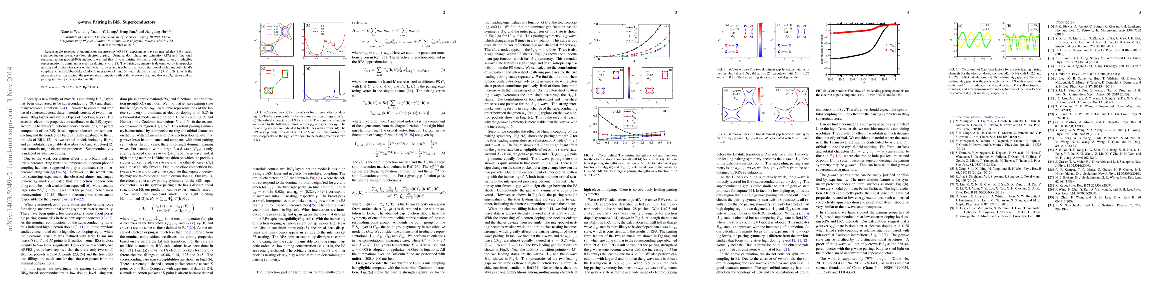 This paper investigates the pairing symmetry in BiS$_2$ superconductors using ARPES, RPA, and FRG methods, finding that $g$-wave pairing (A$_{2g}$ symmetry) dominates at low electron doping. The study reveals that this pairing is robust against Hund's coupling and Hubbard-like interactions, but it competes with s-wave and d-wave symmetries at higher doping levels.