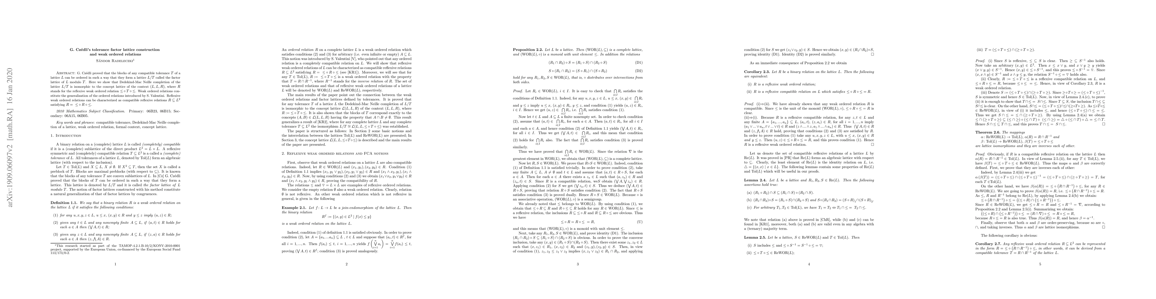 This paper establishes a link between weak ordered relations and factor lattices through tolerance. It proves that the Dedekind-Mac Neille completion of L/T, for any tolerance T of lattice L, is isomorphic to the concept lattice of context (L,L,R), with R being the composition of ≤ with T with ≤.