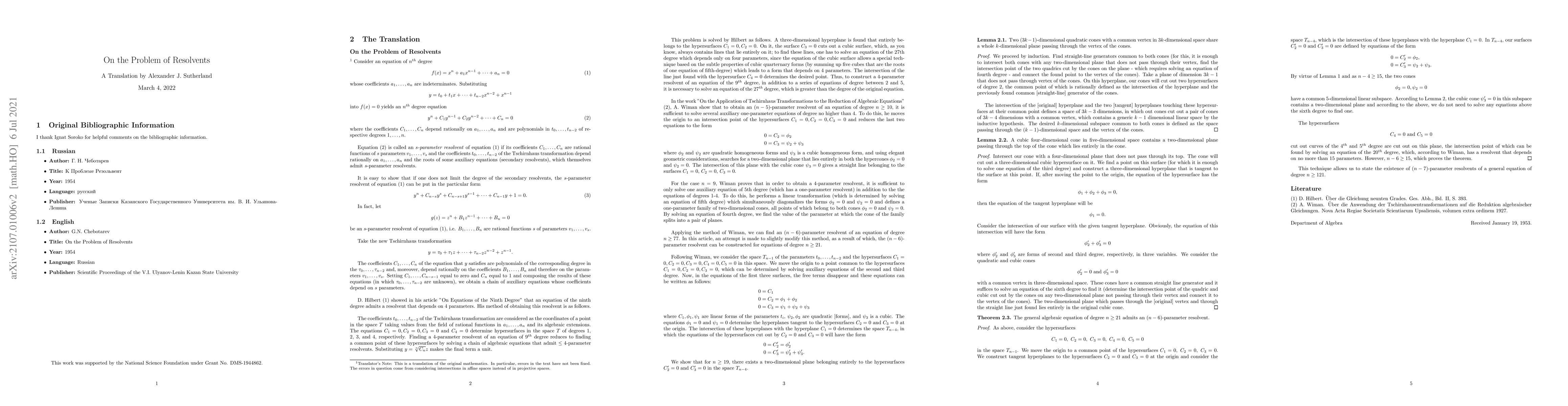 This is an English translation of G.N. Chebotarev's classical paper "On the Problem of Resolvents," which was originally written in Russian and published in Vol. 114, No. 2 of the Scientific Proceedings of the V.I. Ulyanov-Lenin Kazan State University. In this paper, Chebotarev extends the method in Wiman's "On the Application of Tschirnhaus Transformations to the Reduction of Algebraic Equations" to argue that the general polynomial of degree 21 admits a solution using algebraic functions of at most 15 variables. However, his and Wiman's proofs assume that certain intersections in affine space are generic without proof.