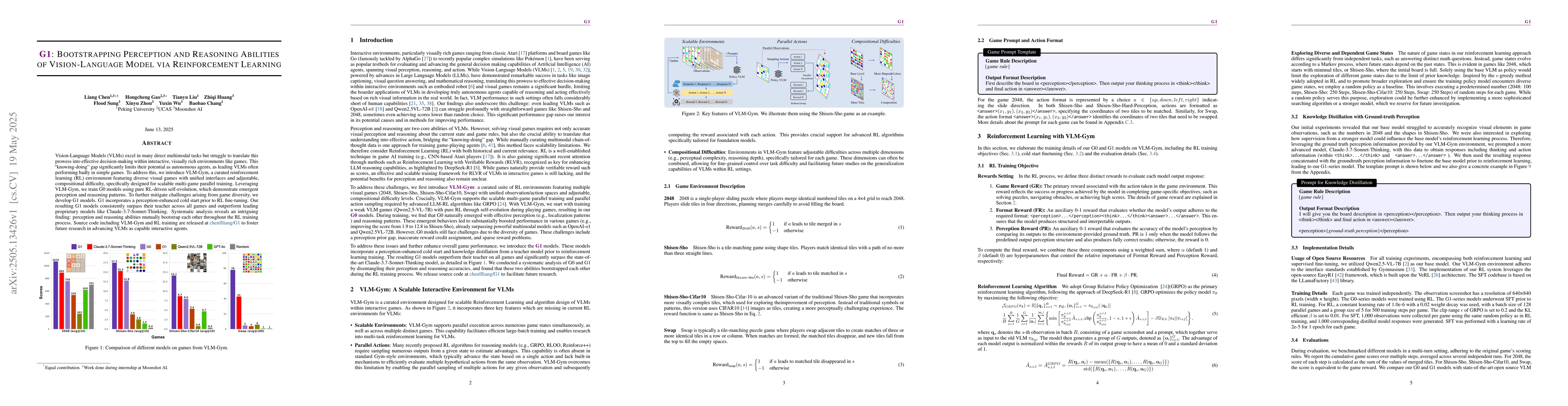 The research introduces VLM-Gym, a reinforcement learning (RL) environment with diverse visual games for scalable multi-game parallel training of Vision-Language Models (VLMs). G0 models are trained using pure RL-driven self-evolution, while G1 models incorporate a perception-enhanced cold start prior to RL fine-tuning.