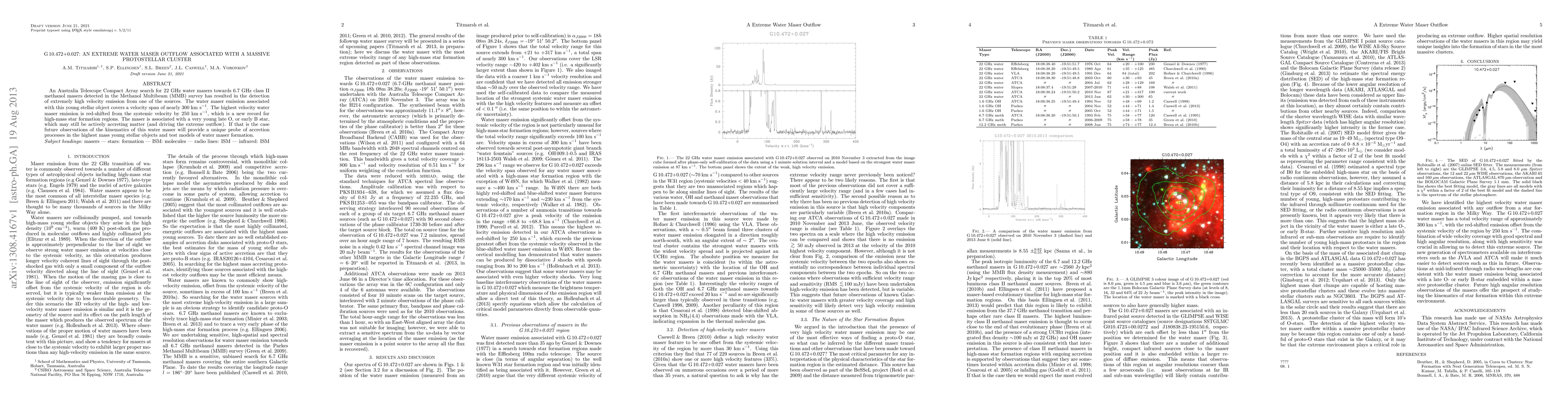 The paper reports the detection of an extreme water maser outflow in G10.472+0.027, associated with a massive protostellar cluster, showing a velocity span of nearly 300 km/s, with the highest velocity red-shifted by 250 km/s, setting a new record for high-mass star formation regions. Future observations may reveal insights into accretion processes in high-mass young stellar objects.