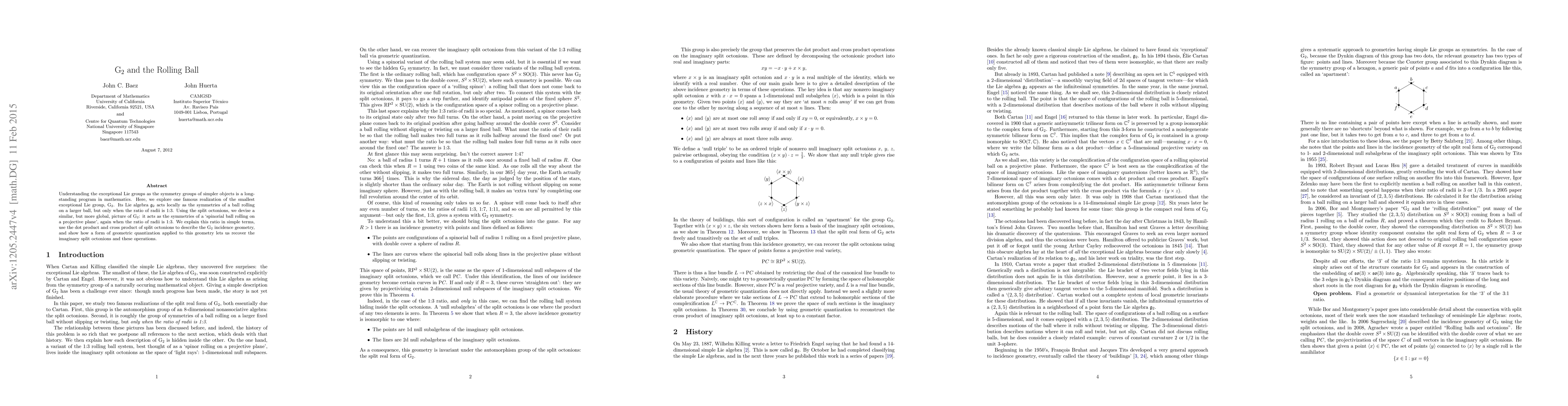 The research explores the Lie group G2 as a symmetry of a specific geometric configuration involving a 'spinorial ball' rolling on a projective plane, revealing new insights into its properties and connections to octonions.