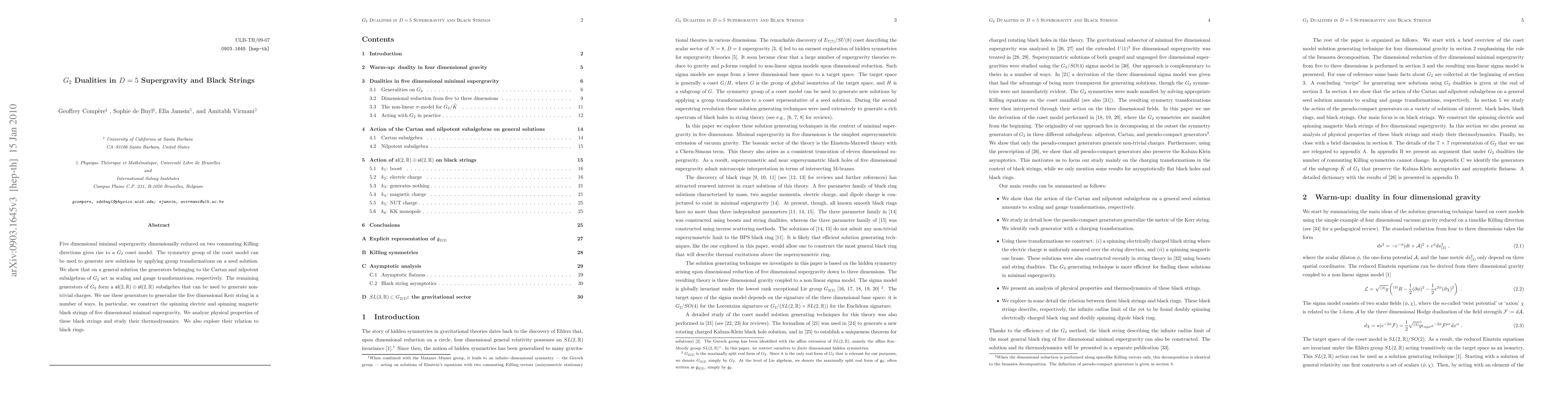 This paper explores G2 dualities in five-dimensional supergravity, demonstrating how symmetry transformations generate new solutions, including spinning electric and magnetic black strings. It analyzes the thermodynamics and properties of these black strings and their relation to black rings.
