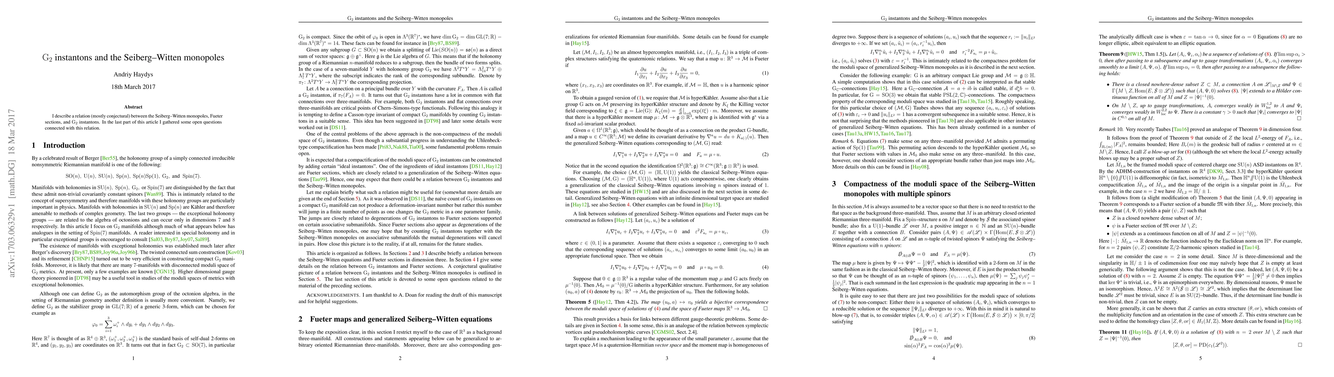 I describe a relation (mostly conjectural) between the Seiberg-Witten monopoles, Fueter sections, and G2 instantons. In the last part of this article I gathered some open questions connected with this relation.