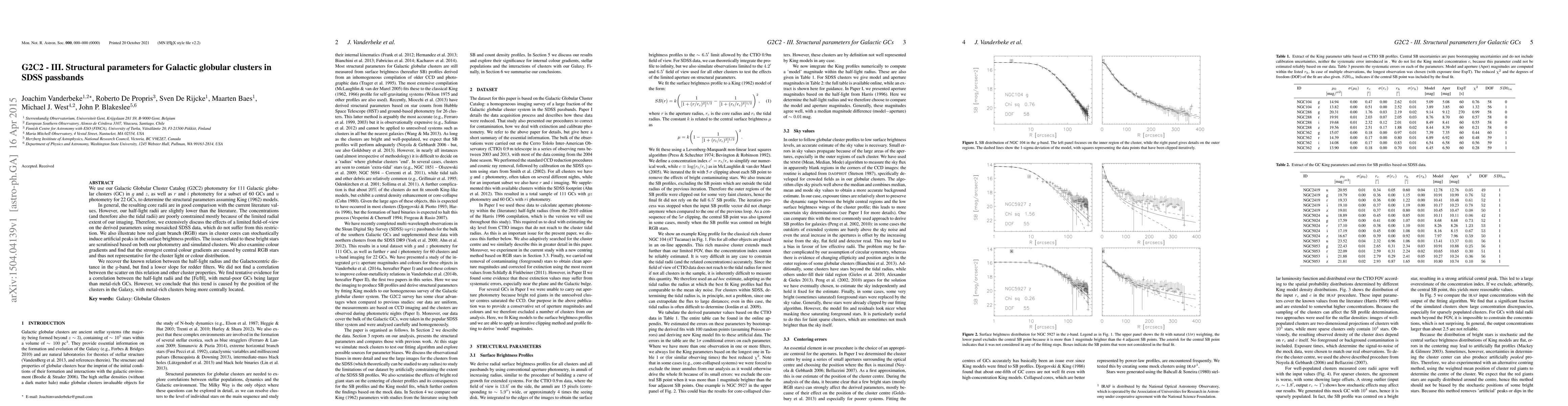This paper uses G2C2 photometry to determine structural parameters of 111 Galactic globular clusters, finding core radii consistent with literature but slightly lower half-light radii. It discusses the impact of limited imaging fields and artificial brightness peaks caused by red giant branch stars, and finds tentative evidence for a correlation between half-light radii and metallicity.