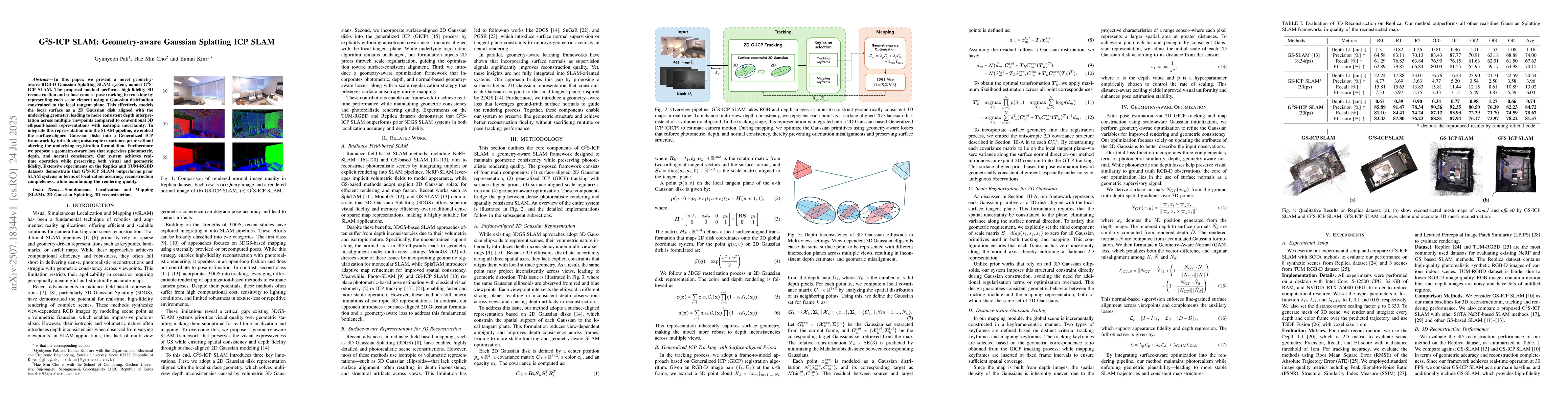 The paper presents G2S-ICP SLAM, a geometry-aware RGB-D Gaussian Splatting SLAM system that performs real-time 3D reconstruction and camera pose tracking. It represents each scene element using a Gaussian distribution constrained to the local tangent plane, integrating this representation into a Generalized ICP framework with anisotropic covariance prior.
