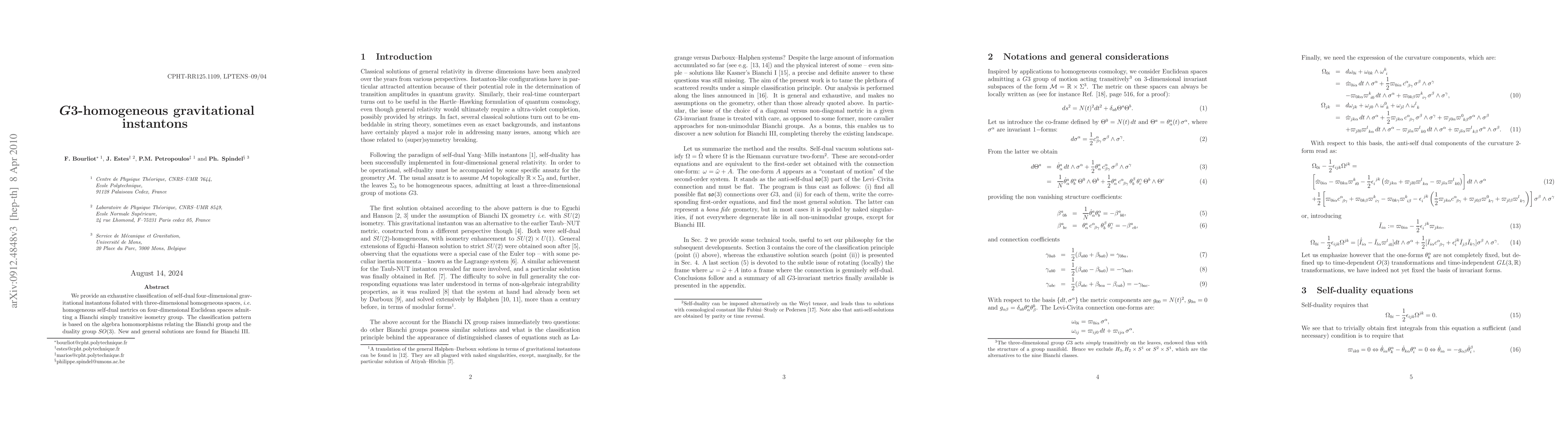 This paper classifies self-dual four-dimensional gravitational instantons with three-dimensional homogeneous spaces, focusing on Bianchi simply transitive isometry groups. New solutions are discovered for Bianchi III through algebra homomorphisms linking the Bianchi group and the duality group SO(3).