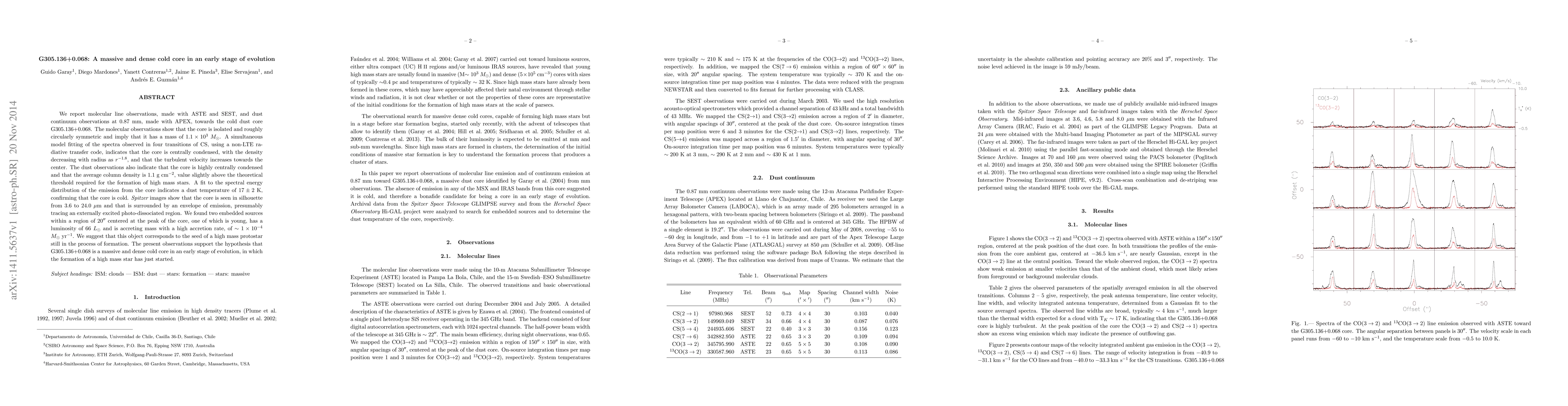 We report molecular line observations, made with ASTE and SEST, and dust continuum observations at 0.87 mm, made with APEX, towards the cold dust core G305.136+0.068. The molecular observations show that the core is isolated and roughly circularly symmetric and imply that it has a mass of $1.1\times10^3~M_\odot$. A simultaneous model fitting of the spectra observed in four transitions of CS, using a non-LTE radiative transfer code, indicates that the core is centrally condensed, with the density decreasing with radius as $r^{-1.8}$, and that the turbulent velocity increases towards the center. The dust observations also indicate that the core is highly centrally condensed and that the average column density is 1.1 g cm$^{-2}$, value slightly above the theoretical threshold required for the formation of high mass stars. A fit to the spectral energy distribution of the emission from the core indicates a dust temperature of $17\pm2$ K, confirming that the core is cold. Spitzer images show that the core is seen in silhouette from 3.6 to 24.0 $\mu$m and that is surrounded by an envelope of emission, presumably tracing an externally excited photo-dissociated region. We found two embedded sources within a region of 20" centered at the peak of the core, one of which is young, has a luminosity of $66~L_\odot$ and is accreting mass with a high accretion rate, of $\sim1\times10^{-4}~M_\odot$ yr$^{-1}$. We suggest that this object corresponds to the seed of a high mass protostar still in the process of formation. The present observations support the hypothesis that G305.136+0.068 is a massive and dense cold core in an early stage of evolution, in which the formation of a high mass star has just started.