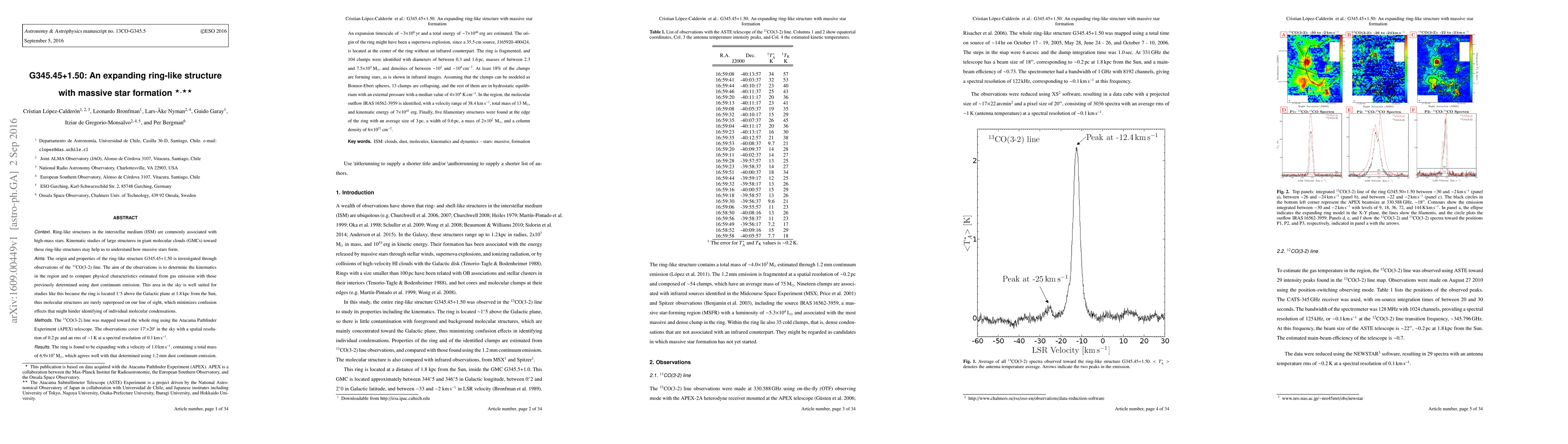 Ring-like structures in the ISM are commonly associated with high-mass stars. Kinematic studies of large structures in GMCs toward these ring-like structures may help us to understand how massive stars form. The origin and properties of the ring-like structure G345.45+1.50 is investigated through observations of the 13CO(3-2) line. The aim of the observations is to determine the kinematics in the region and to compare physical characteristics estimated from gas emission with those previously determined using dust continuum emission. The 13CO(3-2) line was mapped toward the whole ring using the APEX telescope. The ring is found to be expanding with a velocity of 1.0 km/s, containing a total mass of 6.9e3 Msun, which agrees well with that determined using 1.2 mm dust continuum emission. An expansion timescale of 3e6 yr and a total energy of 7e46 erg are estimated. The origin of the ring might have been a supernova explosion, since a 35.5 cm source, J165920-400424, is located at the center of the ring without an infrared counterpart. The ring is fragmented, and 104 clumps were identified with diameters of between 0.3 and 1.6 pc, masses of between 2.3 and 7.5e2 Msun, and densities of between 1.0e2 and 1.0e4 cm^-3. At least 18% of the clumps are forming stars, as is shown in infrared images. Assuming that the clumps can be modeled as Bonnor-Ebert spheres, 13 clumps are collapsing, and the rest of them are in hydrostatic equilibrium with an external pressure with a median value of 4e4 K cm^-3. In the region, the molecular outflow IRAS 16562-3959 is identified, with a velocity range of 38.4 km/s, total mass of 13 Msun, and kinematic energy of 7e45 erg. Finally, five filamentary structures were found at the edge of the ring with an average size of 3 pc, a width of 0.6 pc, a mass of 2e2 Msun, and a column density of 6e21 cm^-2.