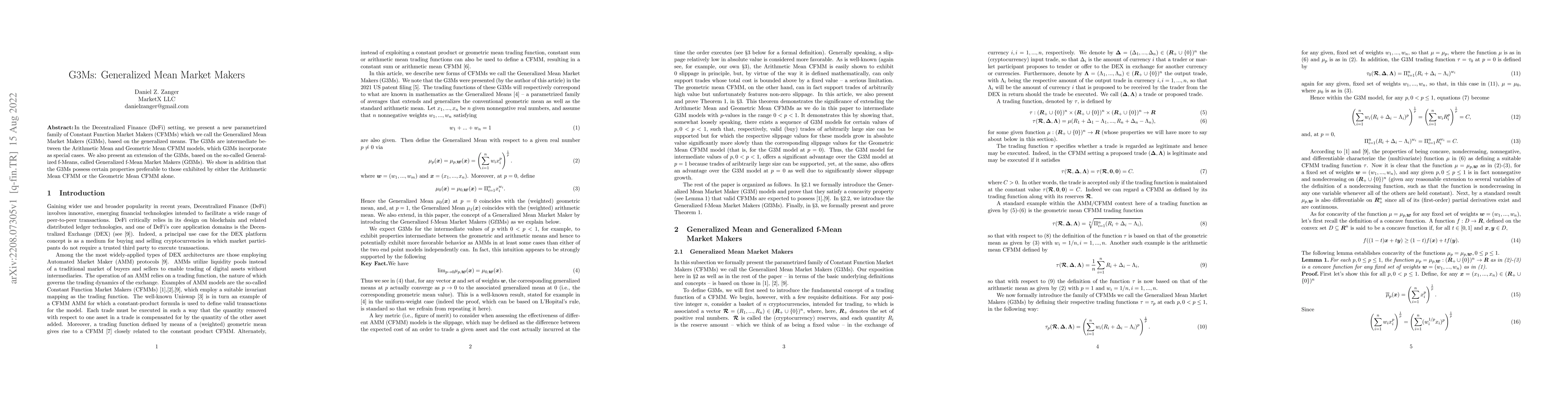 This paper introduces Generalized Mean Market Makers (G3Ms), a new family of Constant Function Market Makers in DeFi, which lie between Arithmetic and Geometric Mean models. It also extends G3Ms to Generalized f-Mean Market Makers (Gf3Ms) and demonstrates that G3Ms offer superior properties over traditional CFMM models.