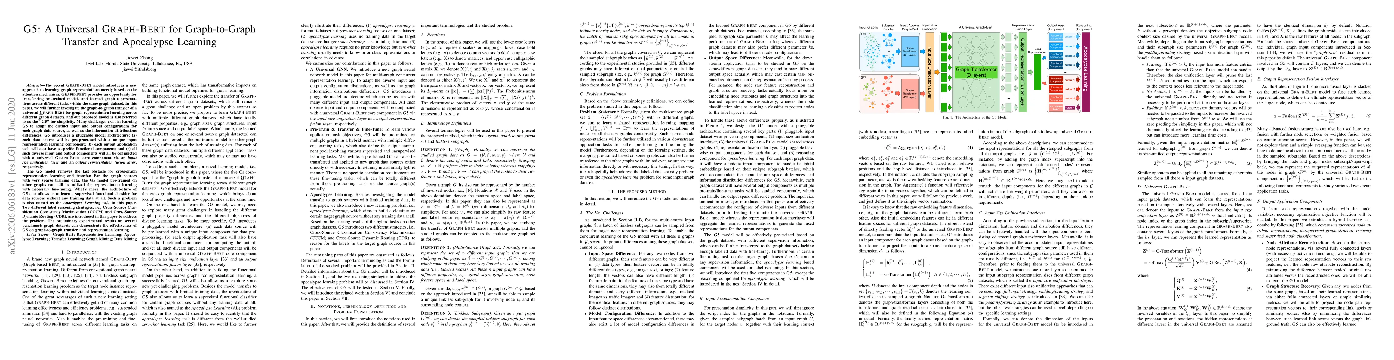 The recent GRAPH-BERT model introduces a new approach to learning graph representations merely based on the attention mechanism. GRAPH-BERT provides an opportunity for transferring pre-trained models and learned graph representations across different tasks within the same graph dataset. In this paper, we will further investigate the graph-to-graph transfer of a universal GRAPH-BERT for graph representation learning across different graph datasets, and our proposed model is also referred to as the G5 for simplicity. Many challenges exist in learning G5 to adapt the distinct input and output configurations for each graph data source, as well as the information distributions differences. G5 introduces a pluggable model architecture: (a) each data source will be pre-processed with a unique input representation learning component; (b) each output application task will also have a specific functional component; and (c) all such diverse input and output components will all be conjuncted with a universal GRAPH-BERT core component via an input size unification layer and an output representation fusion layer, respectively. The G5 model removes the last obstacle for cross-graph representation learning and transfer. For the graph sources with very sparse training data, the G5 model pre-trained on other graphs can still be utilized for representation learning with necessary fine-tuning. What's more, the architecture of G5 also allows us to learn a supervised functional classifier for data sources without any training data at all. Such a problem is also named as the Apocalypse Learning task in this paper. Two different label reasoning strategies, i.e., Cross-Source Classification Consistency Maximization (CCCM) and Cross-Source Dynamic Routing (CDR), are introduced in this paper to address the problem.