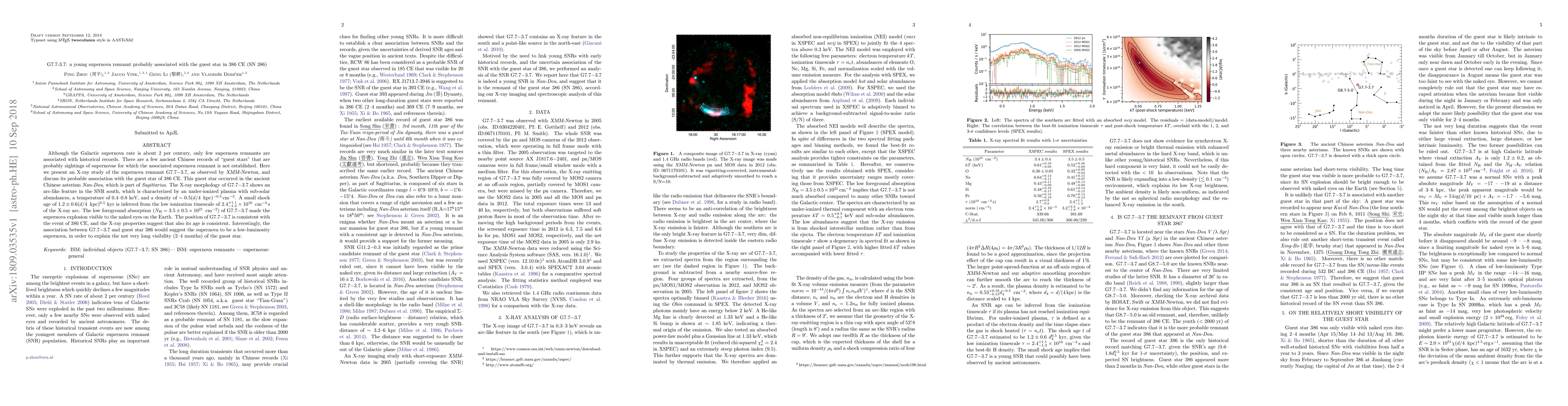 Although the Galactic supernova rate is about 2 per century, only few supernova remnants are associated with historical records. There are a few ancient Chinese records of "guest stars" that are probably sightings of supernovae for which the associated supernova remnant is not established. Here we present an X-ray study of the supernova remnant G7.7-3.7, as observed by XMM-Newton, and discuss its probable association with the guest star of 386 CE. This guest star occurred in the ancient Chinese asterism Nan-Dou, which is part of Sagittarius. The X-ray morphology of G7.7-3.7 shows an arc-like feature in the SNR south, which is characterized by an under-ionized plasma with sub-solar abundances, a temperature of 0.4--0.8 keV, and a density of $\sim 0.5(d/4 kpc)^{-0.5}$ cm$^{-3}$. A small shock age of $1.2\pm 0.6 (d/4 kpc)^{0.5}$ kyr is inferred from the low ionization timescale of $2.4^{+1.1}_{-1.3}\times 10^{10}$ cm$^{-3}$ s of the X-ray arc. The low foreground absorption ($N_H=3.5\pm0.5\times 10^{21}$ cm$^{-2}$) of G7.7-3.7 made the supernova explosion visible to the naked eyes on the Earth. The position of G7.7-3.7 is consistent with the event of 386 CE, and the X-ray properties suggest that also its age is consistent. Interestingly, the association between G7.7-3.7 and guest star 386 would suggest the supernova to be a low-luminosity supernova, in order to explain the not very long visibility (2--4 months) of the guest star.