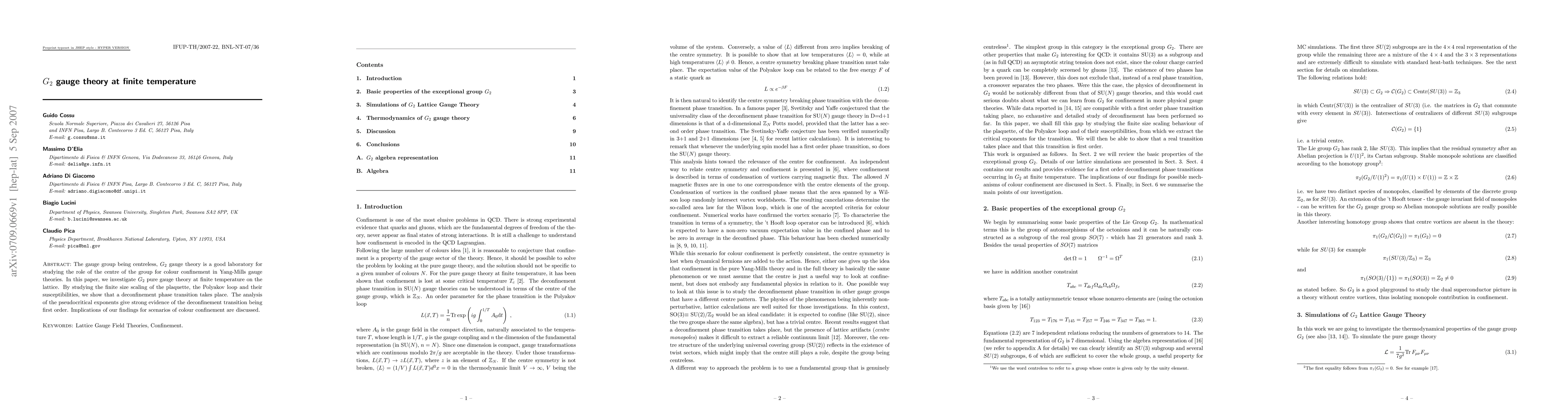 This paper investigates $G_2$ gauge theory at finite temperature on the lattice, revealing a first-order deconfinement phase transition through the analysis of the plaquette, Polyakov loop, and their susceptibilities. The study provides insights into the role of the centreless gauge group in colour confinement mechanisms.