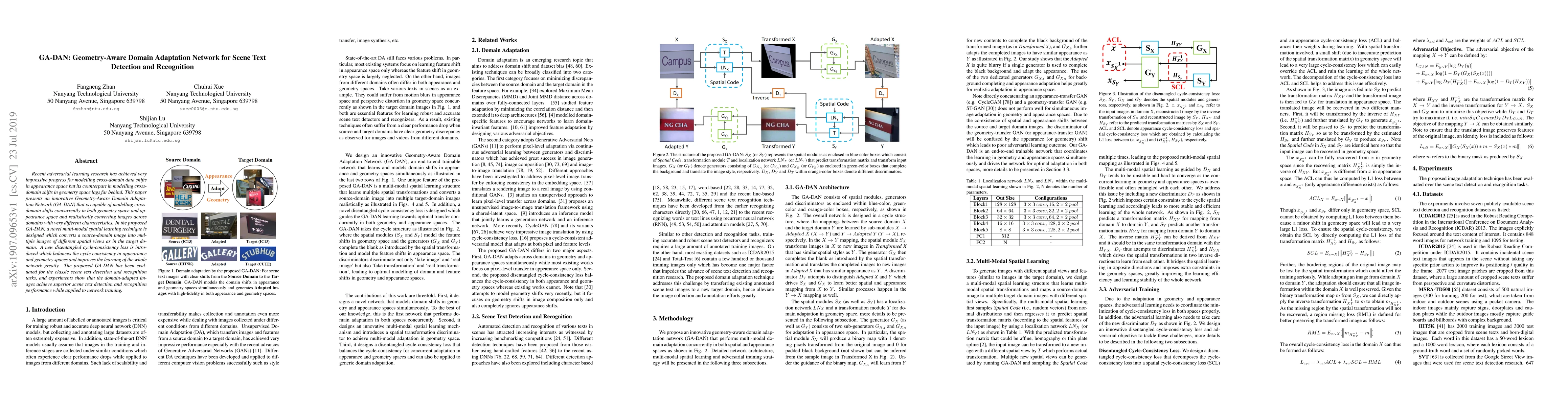 The paper introduces GA-DAN, a Geometry-Aware Domain Adaptation Network that models cross-domain shifts in both geometry and appearance spaces for scene text detection and recognition. It employs a multi-modal spatial learning technique and a disentangled cycle-consistency loss to achieve superior performance in domain-adapted images.