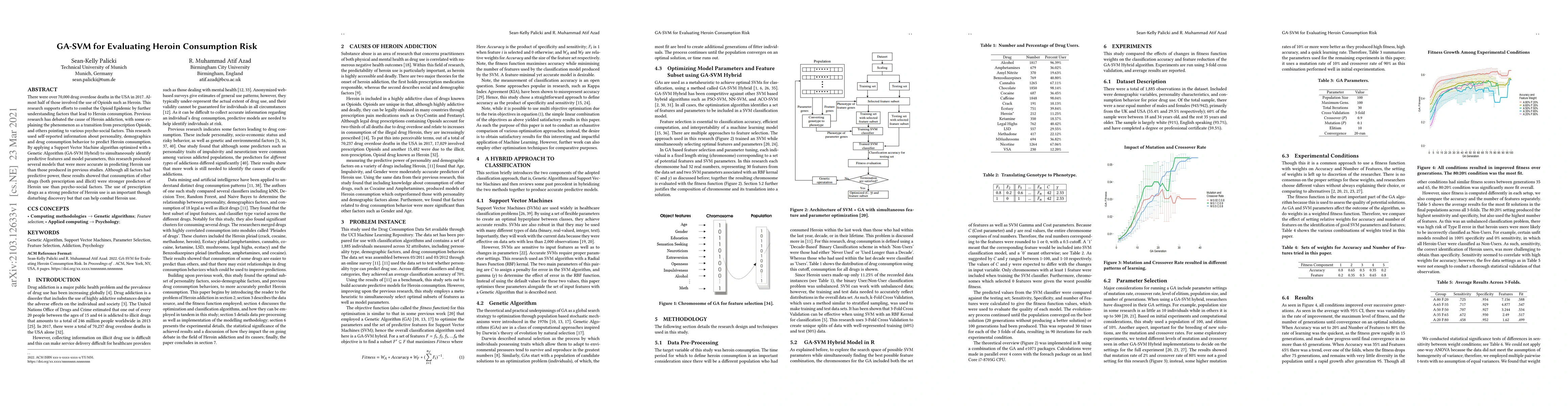 There were over 70,000 drug overdose deaths in the USA in 2017. Almost half of those involved the use of Opioids such as Heroin. This research supports efforts to combat the Opioid Epidemic by further understanding factors that lead to Heroin consumption. Previous research has debated the cause of Heroin addiction, with some explaining the phenomenon as a transition from prescription Opioids, and others pointing to various psycho-social factors. This research used self-reported information about personality, demographics and drug consumption behavior to predict Heroin consumption. By applying a Support Vector Machine algorithm optimized with a Genetic Algorithm (GA-SVM Hybrid) to simultaneously identify predictive features and model parameters, this research produced several models that were more accurate in predicting Heroin use than those produced in previous studies. Although all factors had predictive power, these results showed that consumption of other drugs (both prescription and illicit) were stronger predictors of Heroin use than psycho-social factors. The use of prescription drugs as a strong predictor of Heroin use is an important though disturbing discovery but that can help combat Heroin use.