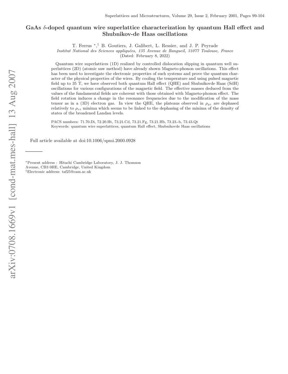 This study characterizes GaAs delta-doped quantum wire superlattices using the quantum Hall effect and Shubnikov de Haas oscillations, revealing coherent effective masses and linking the observed plateaus in resistivity to the dephasing of Landau levels. The findings support the quantum nature of the electronic properties in these 1D systems.