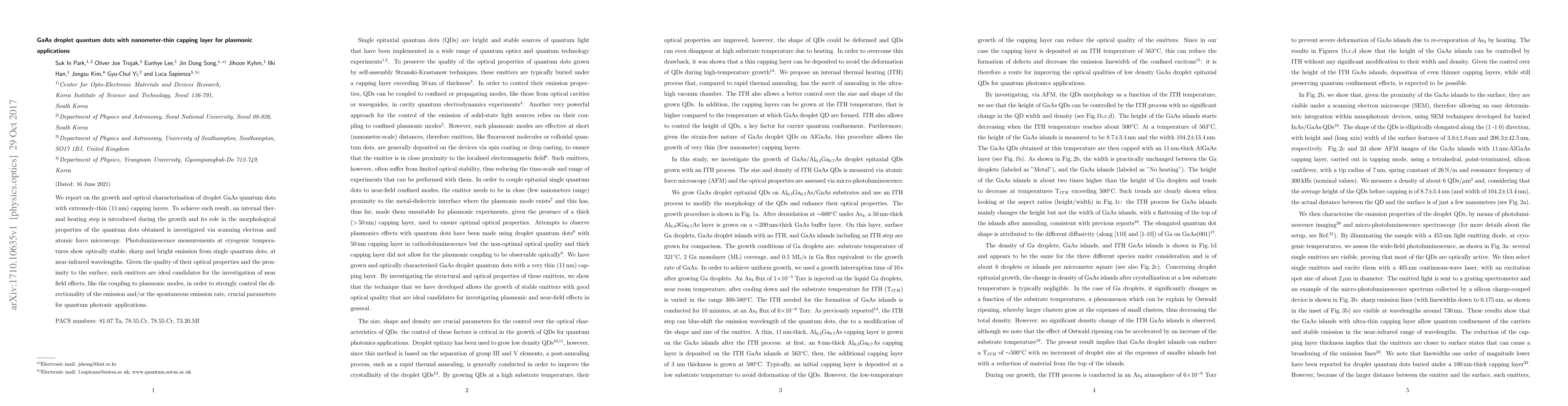 We report on the growth and optical characterisation of droplet GaAs quantum dots with extremely-thin (11 nm) capping layers. To achieve such result, an internal thermal heating step is introduced during the growth and its role in the morphological properties of the quantum dots obtained is investigated via scanning electron and atomic force microscopy. Photoluminescence measurements at cryogenic temperatures show optically stable, sharp and bright emission from single quantum dots, at near-infrared wavelengths. Given the quality of their optical properties and the proximity to the surface, such emitters are ideal candidates for the investigation of near field effects, like the coupling to plasmonic modes, in order to strongly control the directionality of the emission and/or the spontaneous emission rate, crucial parameters for quantum photonic applications.