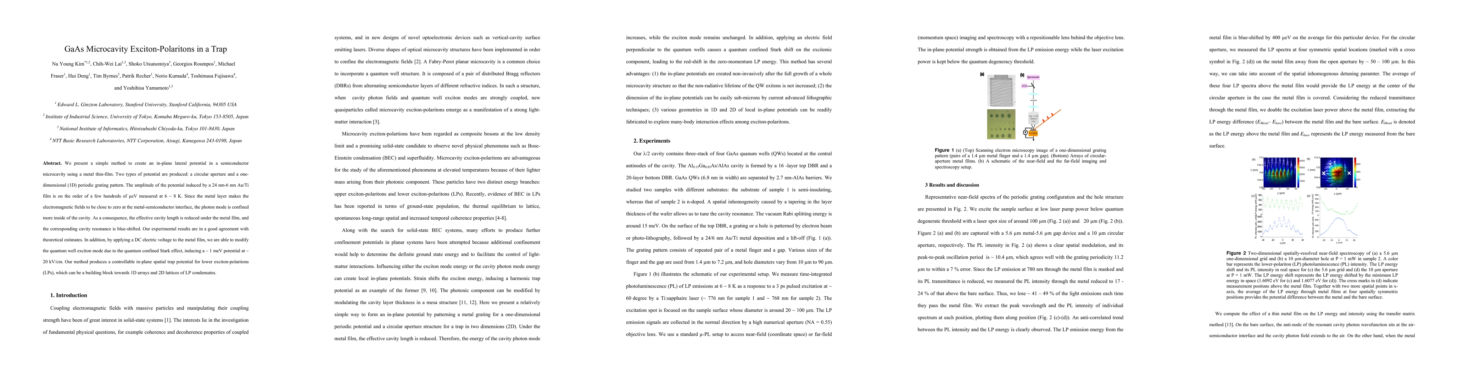 The research presents a method to create an in-plane lateral potential in a semiconductor microcavity using a metal thin-film, resulting in two types of potentials: circular aperture and 1D periodic grating pattern. The method involves using a 24 nm-6 nm Au/Ti film to induce potentials on the order of a few hundreds of µeV at 6-8 K.
