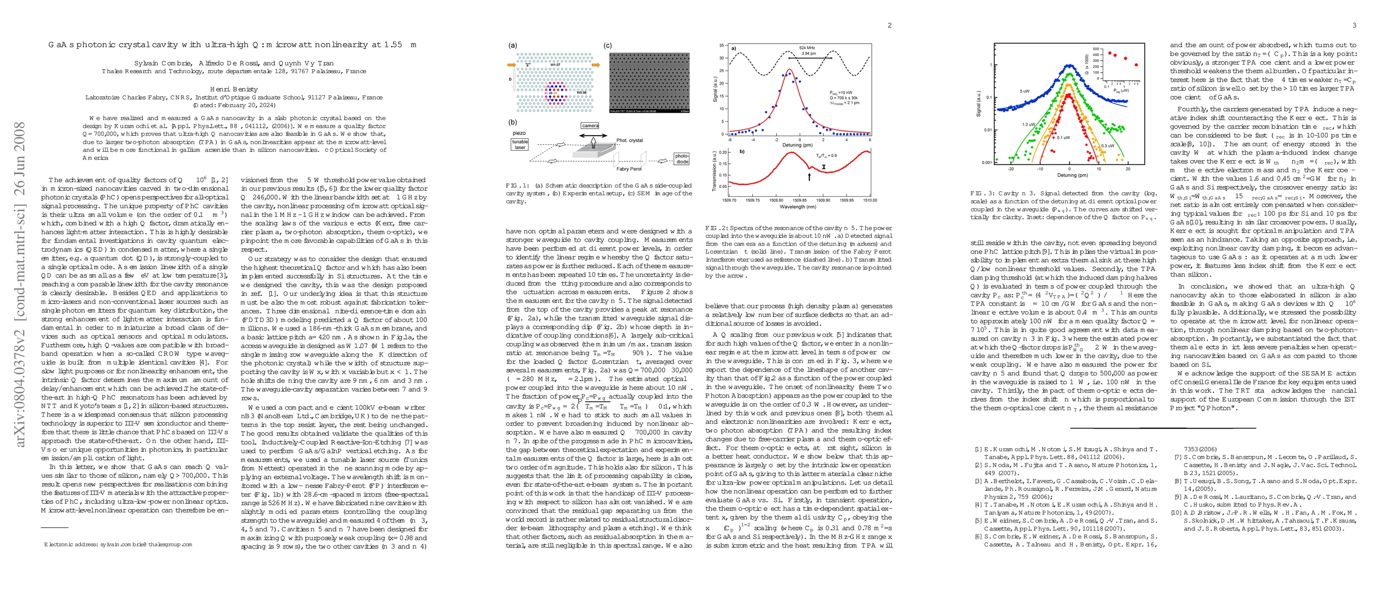 Summary: The research reports the realization of a GaAs photonic crystal cavity with an ultra-high quality factor (Q=700,000), demonstrating feasibility in GaAs. The study highlights the significant microwatt-level nonlinearities due to higher two-photon absorption, suggesting enhanced functionality over silicon nanocavities.