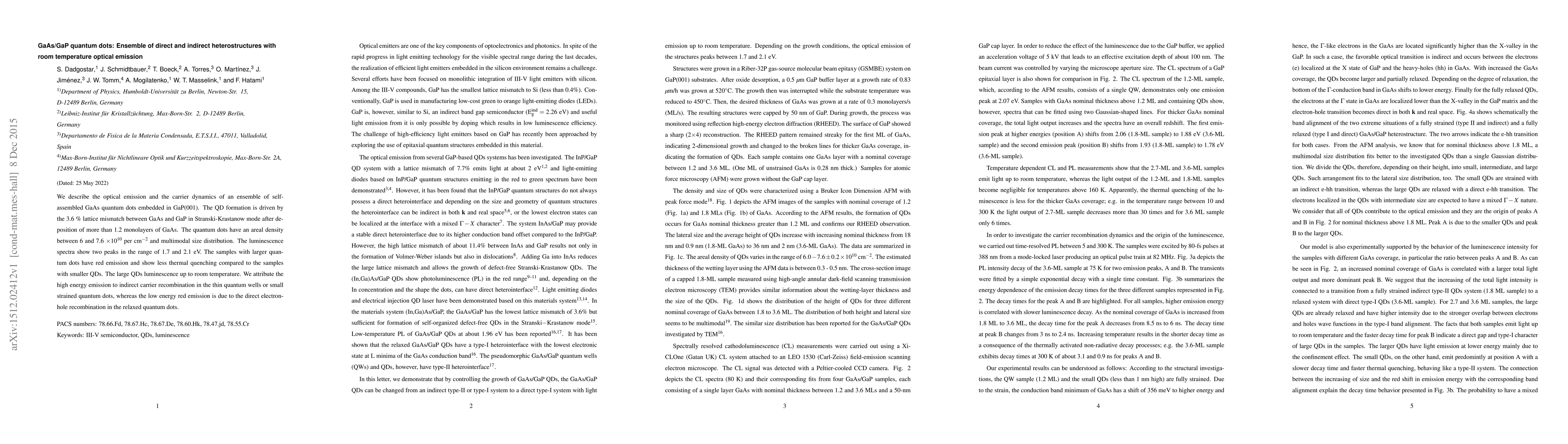 We describe the optical emission and the carrier dynamics of an ensemble of self-assembled GaAs quantum dots embedded in GaP(001). The QD formation is driven by the 3.6 % lattice mismatch between GaAs and GaP in Stranski-Krastanow mode after deposition of more than 1.2 monolayers of GaAs. The quantum dots have an areal density between 6 and 7.6x1010 per cm-2 and multimodal size distribution. The luminescence spectra show two peaks in the range of 1.7 and 2.1 eV. The samples with larger quantum dots have red emission and show less thermal quenching compared to the samples with smaller QDs. The large QDs luminescence up to room temperature. We attribute the high energy emission to indirect carrier recombination in the thin quantum wells or small strained quantum dots, whereas the low energy red emission is due to the direct electron-hole recombination in the relaxed quantum dots.