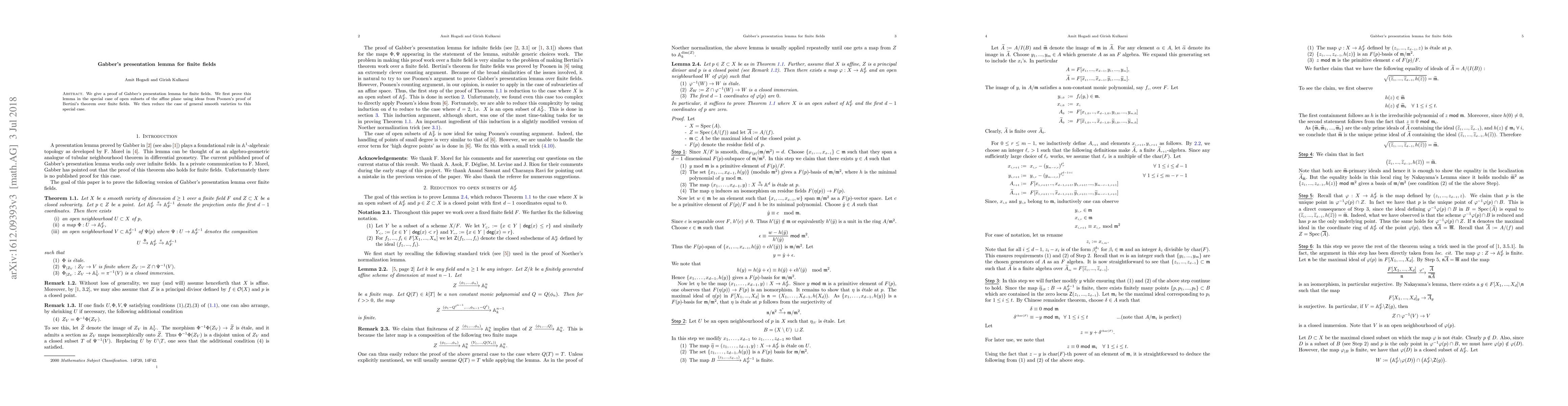 We give a proof of Gabber's presentation lemma for finite fields. We use ideas from Poonen's proof of Bertini's theorem to prove this lemma in the special case of open subsets of the affine plane. We then reduce the case of general smooth varieties to this special case.