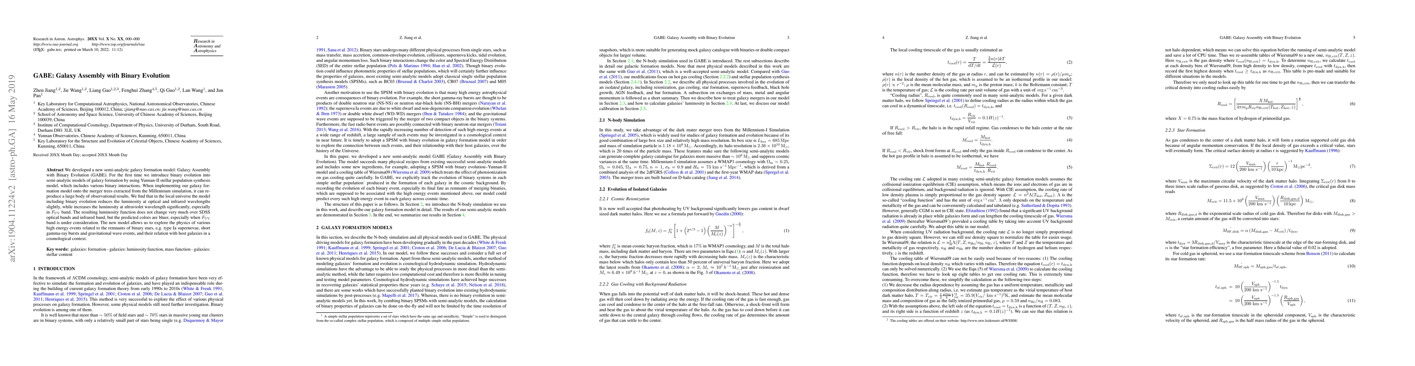 We developed a new semi-analytic galaxy formation model: Galaxy Assembly with Binary Evolution (GABE). For the first time we introduce binary evolution into semi-analytic models of galaxy formation by using Yunnan-II stellar population synthesis model, which includes various binary interactions. When implementing our galaxy formation model onto the merger trees extracted from the Millennium simulation, it can reproduce a large body of observational results. We find that in the local universe the model including binary evolution reduces the luminosity at optical and infrared wavelengths slightly, while increases the luminosity at ultraviolet wavelength significantly, especially in $F_{\rm UV}$ band. The resulting luminosity function does not change very much over SDSS optical bands and infrared band, but the predicted colors are bluer, especially when $F_{\rm UV}$ band is under consideration. The new model allows us to explore the physics of various high energy events related to the remnants of binary stars, e.g. type Ia supernovae, short gamma-ray bursts and gravitational wave events, and their relation with host galaxies in a cosmological context.