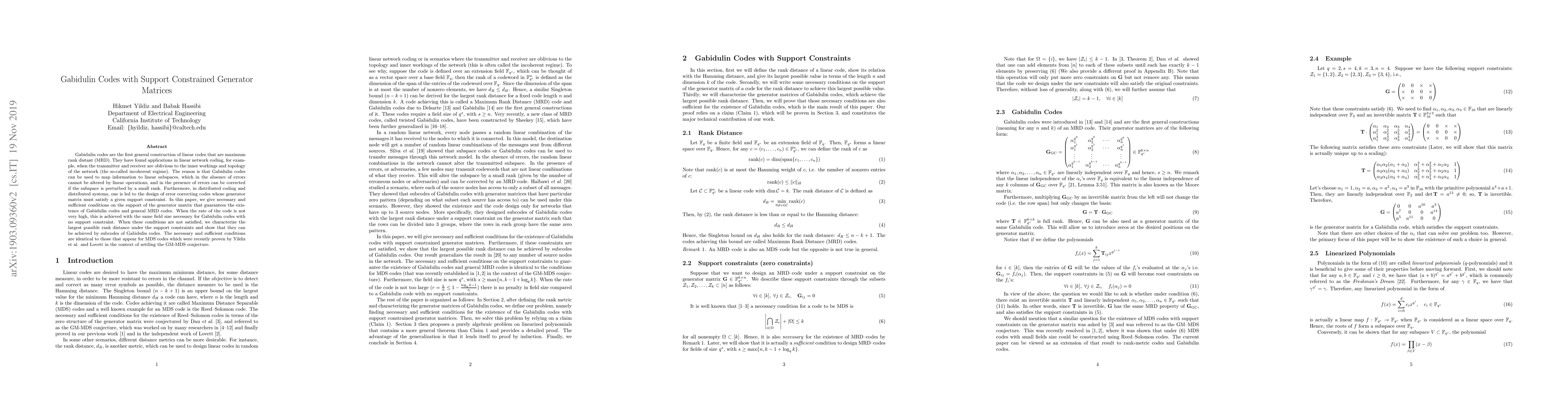 This paper explores Gabidulin codes under support constraints on their generator matrices, providing necessary and sufficient conditions for their existence and optimal rank distance. It demonstrates that under certain conditions, Gabidulin codes can maintain their properties even with support constraints, while otherwise characterizing the largest achievable rank distance via subcodes of Gabidulin codes.