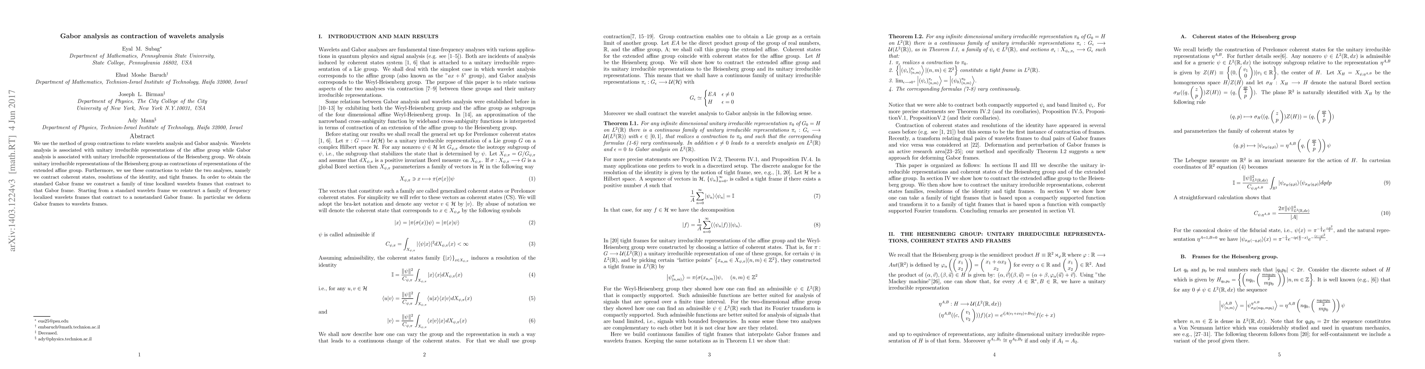 We use the method of group contractions to relate wavelets analysis and Gabor analysis. Wavelets analysis is associated with unitary irreducible representations of the affine group while Gabor analysis is associated with unitary irreducible representations of the Heisenberg group. We obtain unitary irreducible representations of the Heisenberg group as contractions of representations of the extended affine group. Furthermore, we use these contractions to relate the two analyses, namely we contract coherent states, resolutions of the identity, and tight frames. In order to obtain the standard Gabor frame we construct a family of time localized wavelets frames that contract to that Gabor frame. Starting from a standard wavelets frame we construct a family of frequency localized wavelets frames that contract to a nonstandard Gabor frame. In particular we deform Gabor frames to wavelets frames.