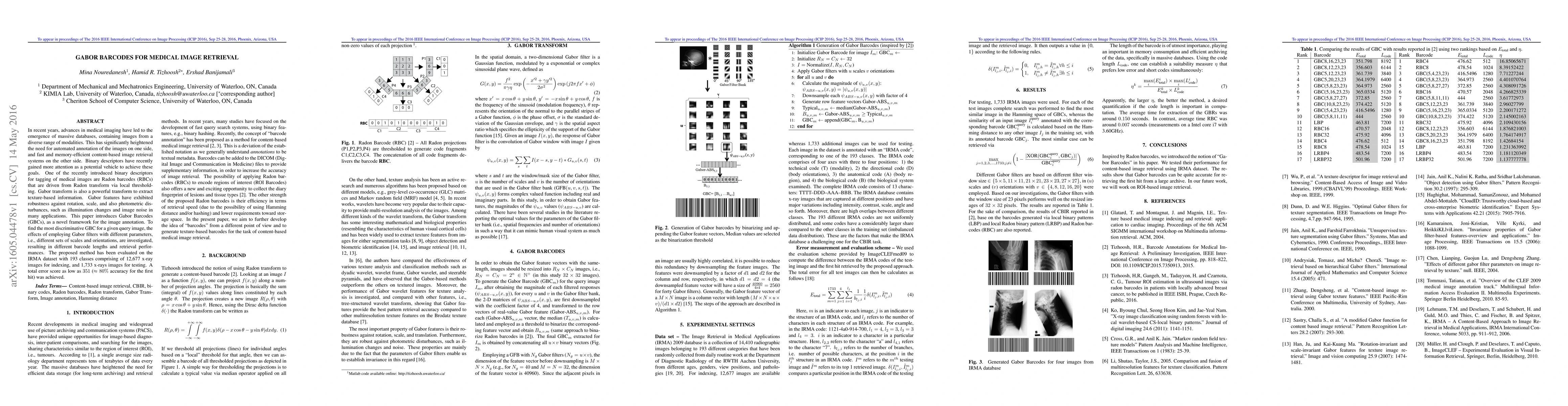 This paper introduces Gabor Barcodes (GBCs) as a novel framework for medical image retrieval, leveraging Gabor transform to extract robust texture features. The method was evaluated on the IRMA dataset, achieving an accuracy of approximately 80% for the first retrieval hit.