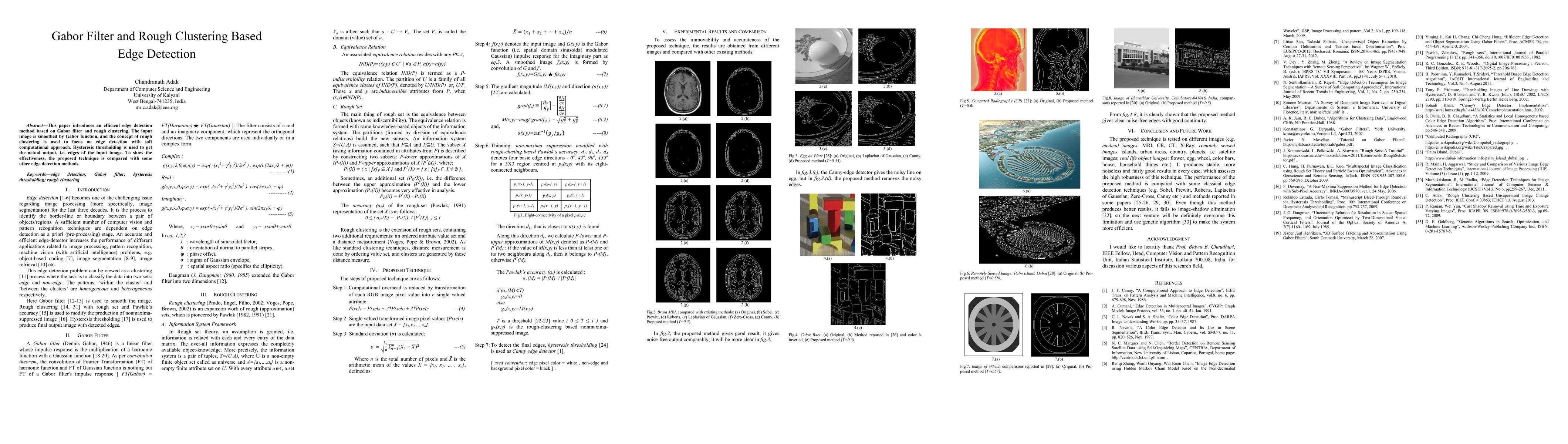 This paper proposes an edge detection method using Gabor filters and rough clustering, which smooths the input image and employs a soft computational approach for edge detection, followed by hysteresis thresholding for final edge extraction, demonstrating its effectiveness against other methods.