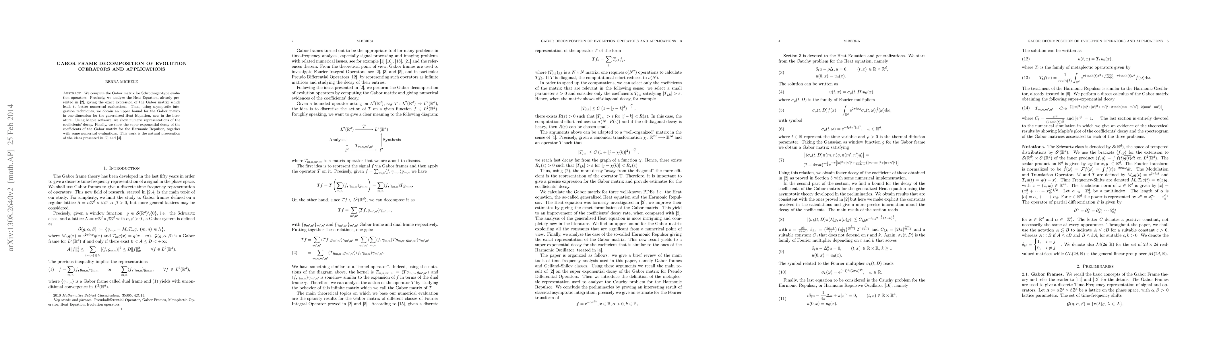 This paper computes the Gabor matrix for Schrödinger-type evolution operators, specifically analyzing the Heat Equation and generalized Heat Equation. It provides exact expressions and upper bounds for these matrices, demonstrating super-exponential decay of coefficients for the Harmonic Repulsor, and uses numerical evaluations to support its findings.